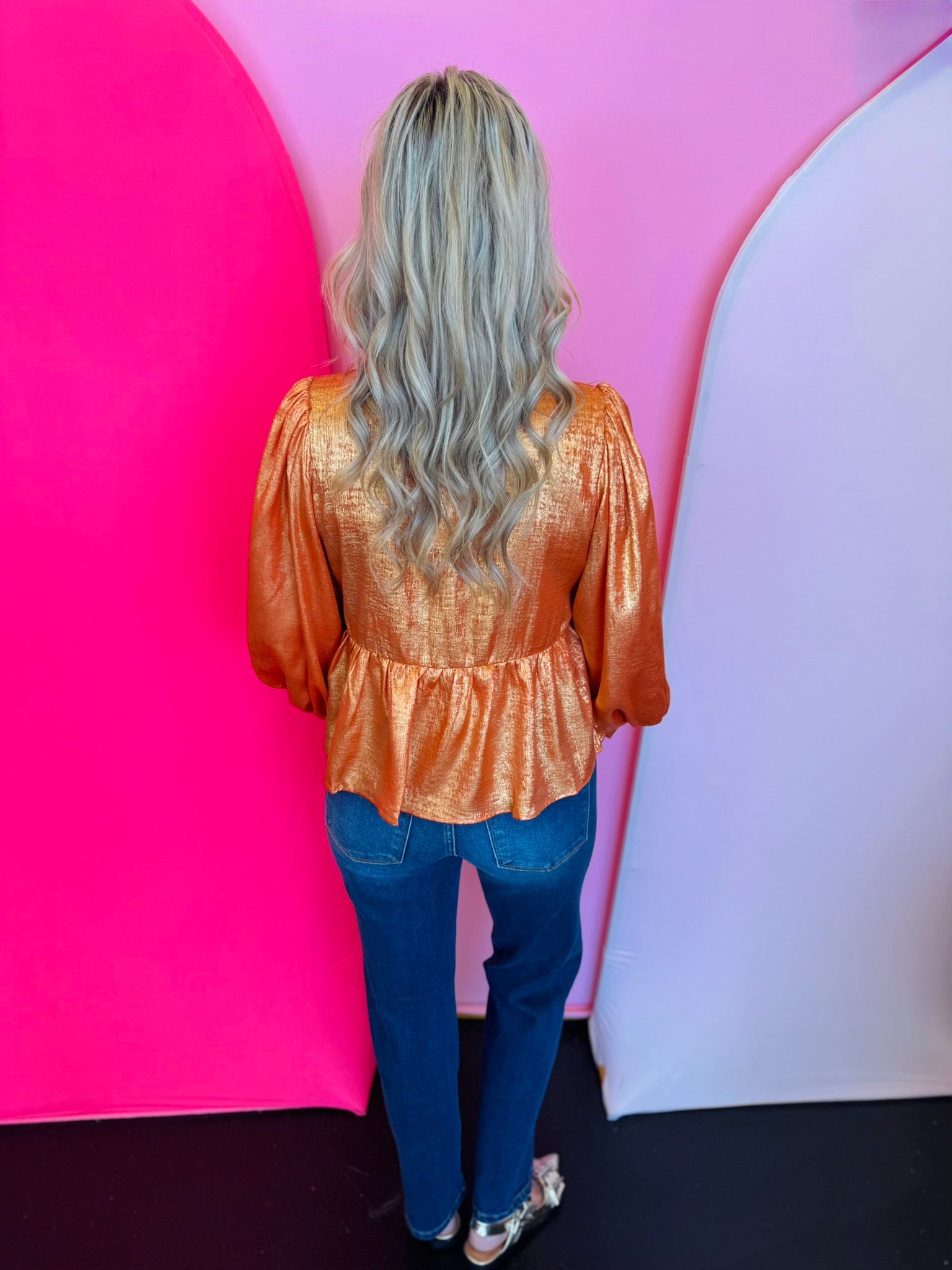 Orange Metallic Bow Peplum Top