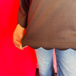Effortlessly chic, the Black Scallop Top is a timeless wardrobe essential that pairs classic design with feminine detail. Crafted from a soft, lightweight blend of rayon, polyester, and spandex, this top offers the perfect balance of comfort and stretch. It features a flattering V-neckline framed by a subtle collared detail and elegant scalloped edging along the neckline and hem for a polished finish. The 3/4 sleeves add versatility, making it ideal for year-round wear — perfect for pairing with jeans, trousers, or skirts for a sophisticated, put-together look that transitions seamlessly from work to weekend.