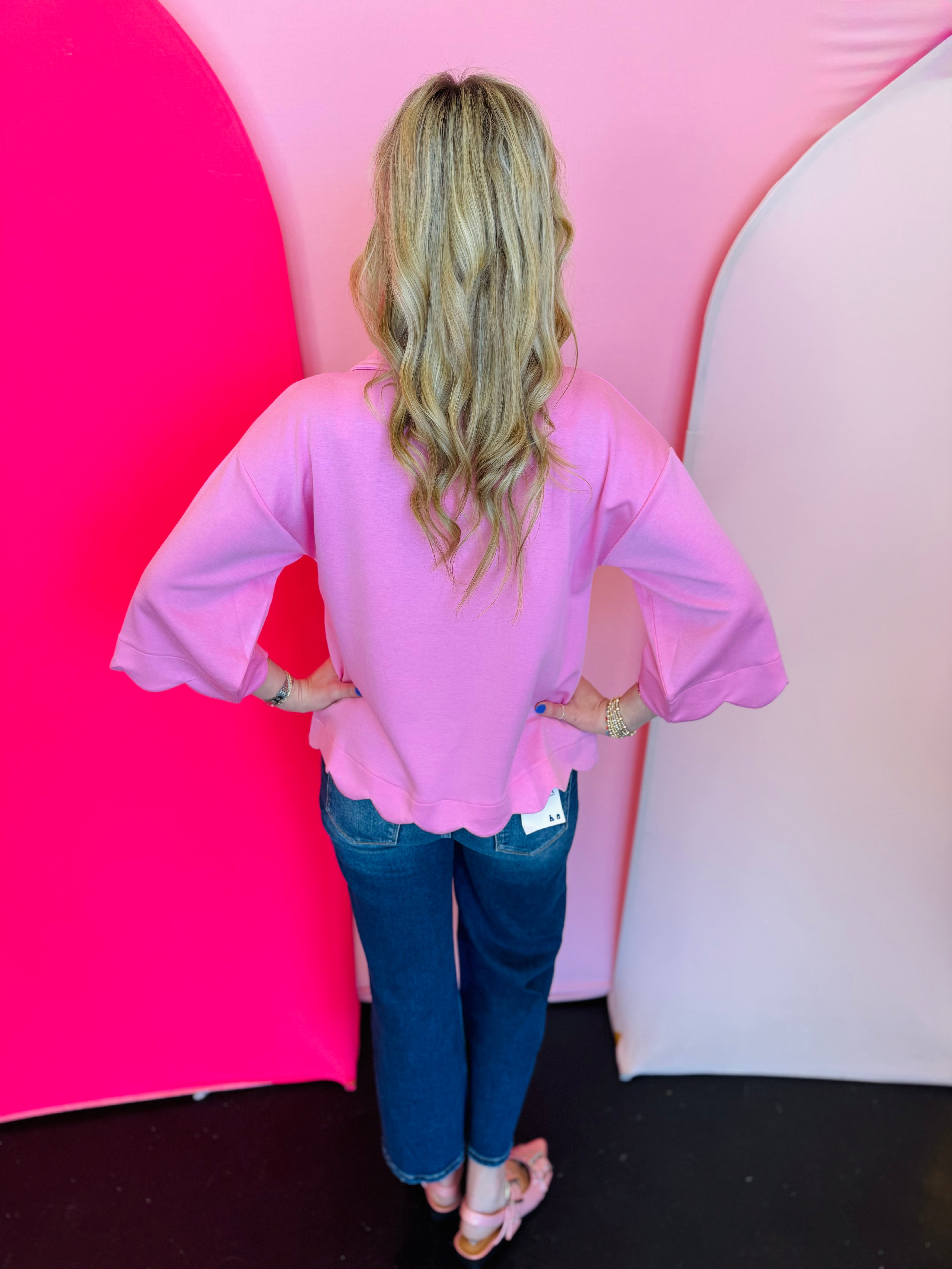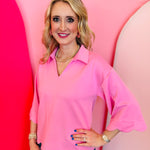 Pink scallop top with V-neck, collared detail, and scalloped trim.