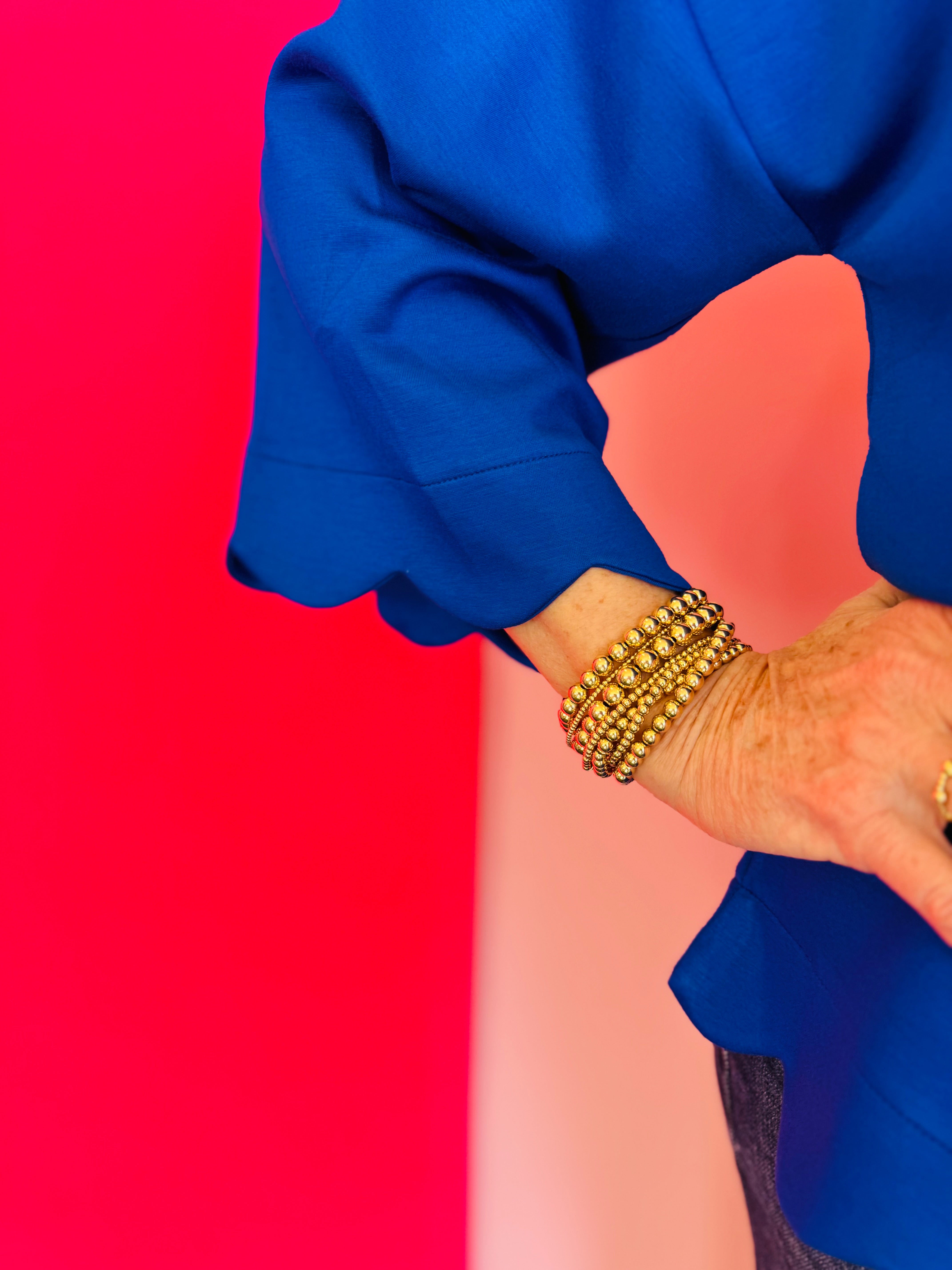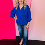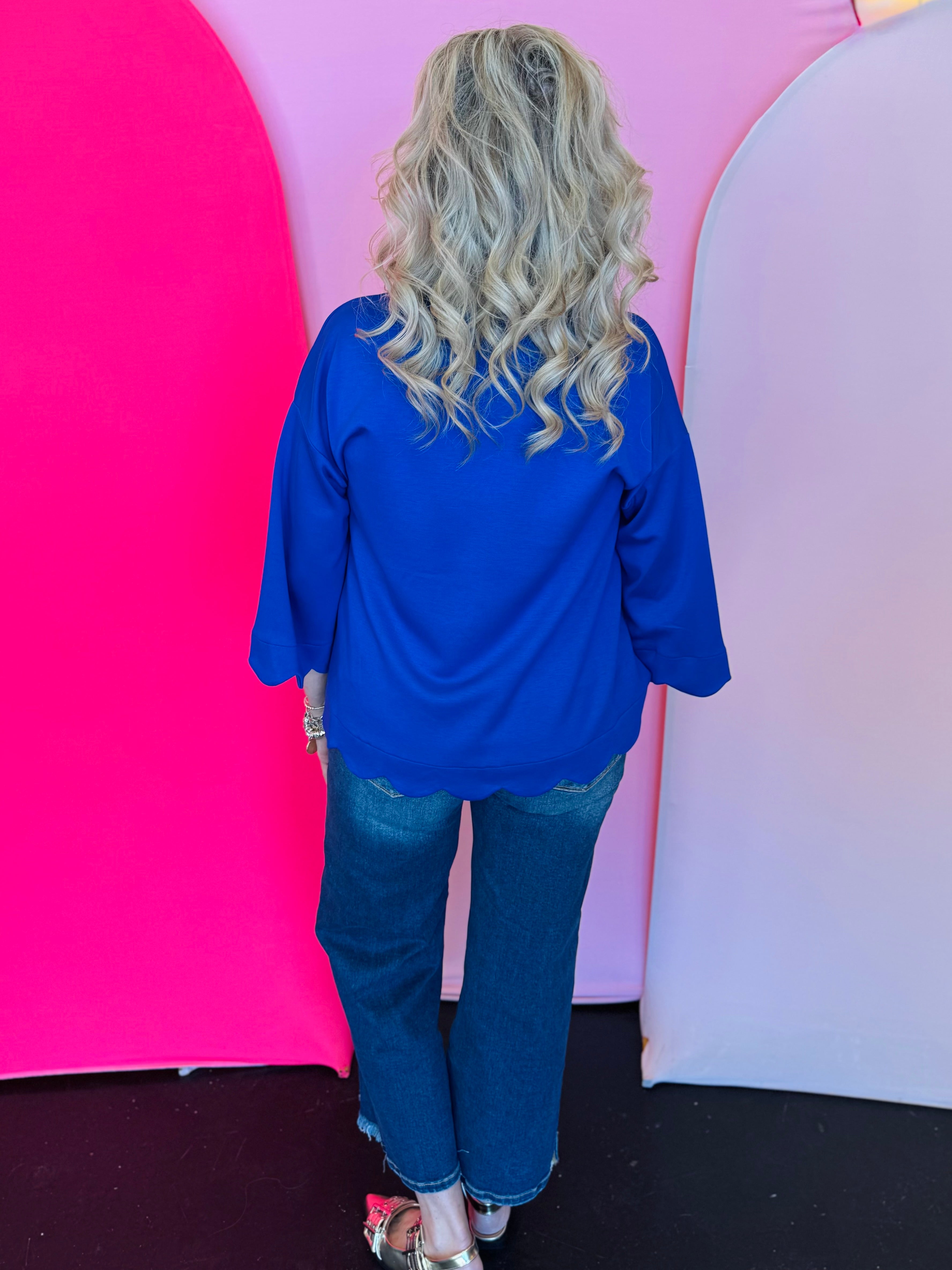 Royal blue scallop top with V-neck, collared detail, and scalloped trim.