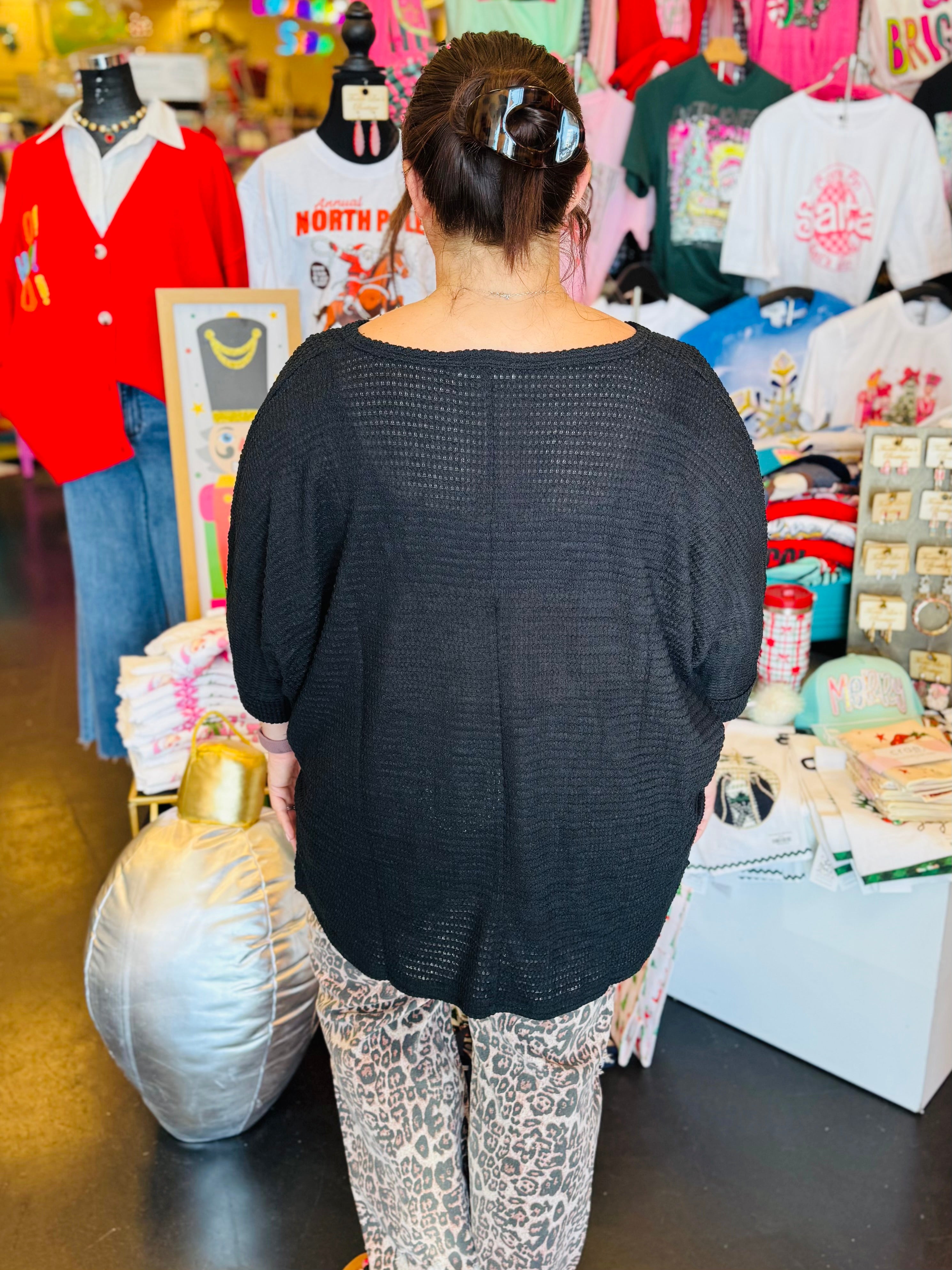 Upgrade your everyday wardrobe with the V-Neck Black Waffle Knit Top, a chic and comfortable staple designed for effortless, everyday style. The relaxed boxy silhouette drapes beautifully, offering a flattering, easygoing fit that pairs perfectly with jeans, leggings, or shorts. Crafted from a loosely woven waffle knit fabric, this top delivers lightweight breathability while keeping your look polished and modern.