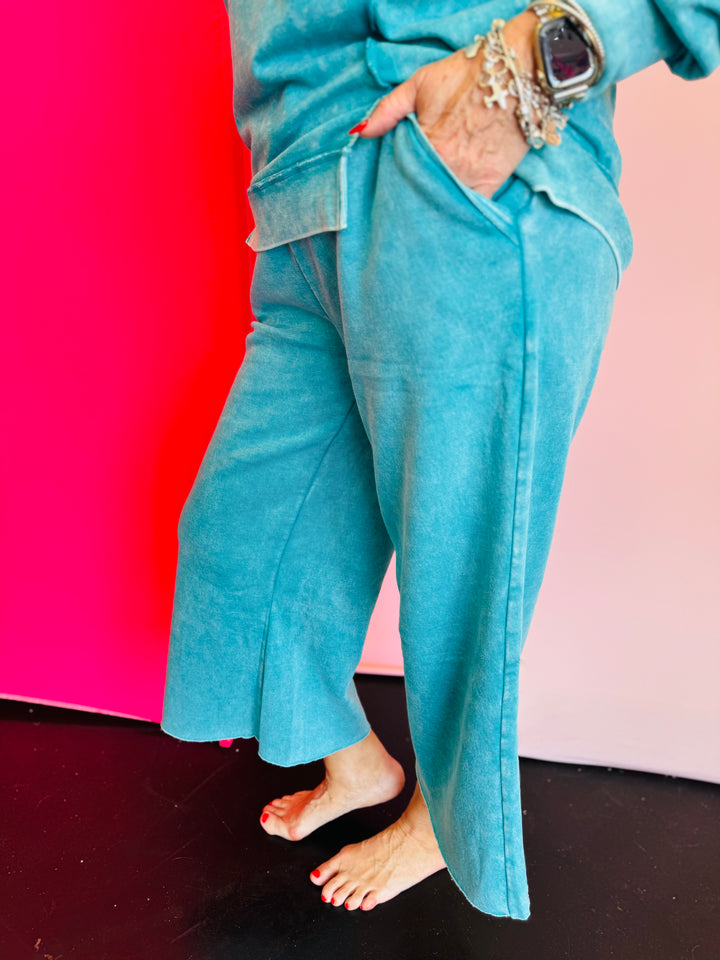 Relax in on-trend comfort with our Acid Wash Fleece Palazzo Sweatpants, a stylish addition to your lounge or streetwear collection. Crafted from a soft cotton-poly blend, these sweatpants offer cozy warmth with a lightweight, breathable feel. The distinctive acid wash finish provides a vintage, lived-in look, while the wide-leg palazzo cut ensures effortless movement and all-day comfort. A trendy raw hem adds a modern, laid-back finish. Featuring a drawstring band waist for a custom, adjustable fit and roomy side pockets to keep your essentials secure, these pants are both practical and chic. Perfect for off-duty days, travel, or casual outings, they combine style and everyday versatility.