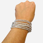 Set of seven silver water-resistant beaded bracelets with stretch fit for stylish stacking and comfort.