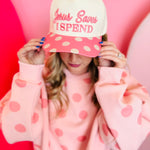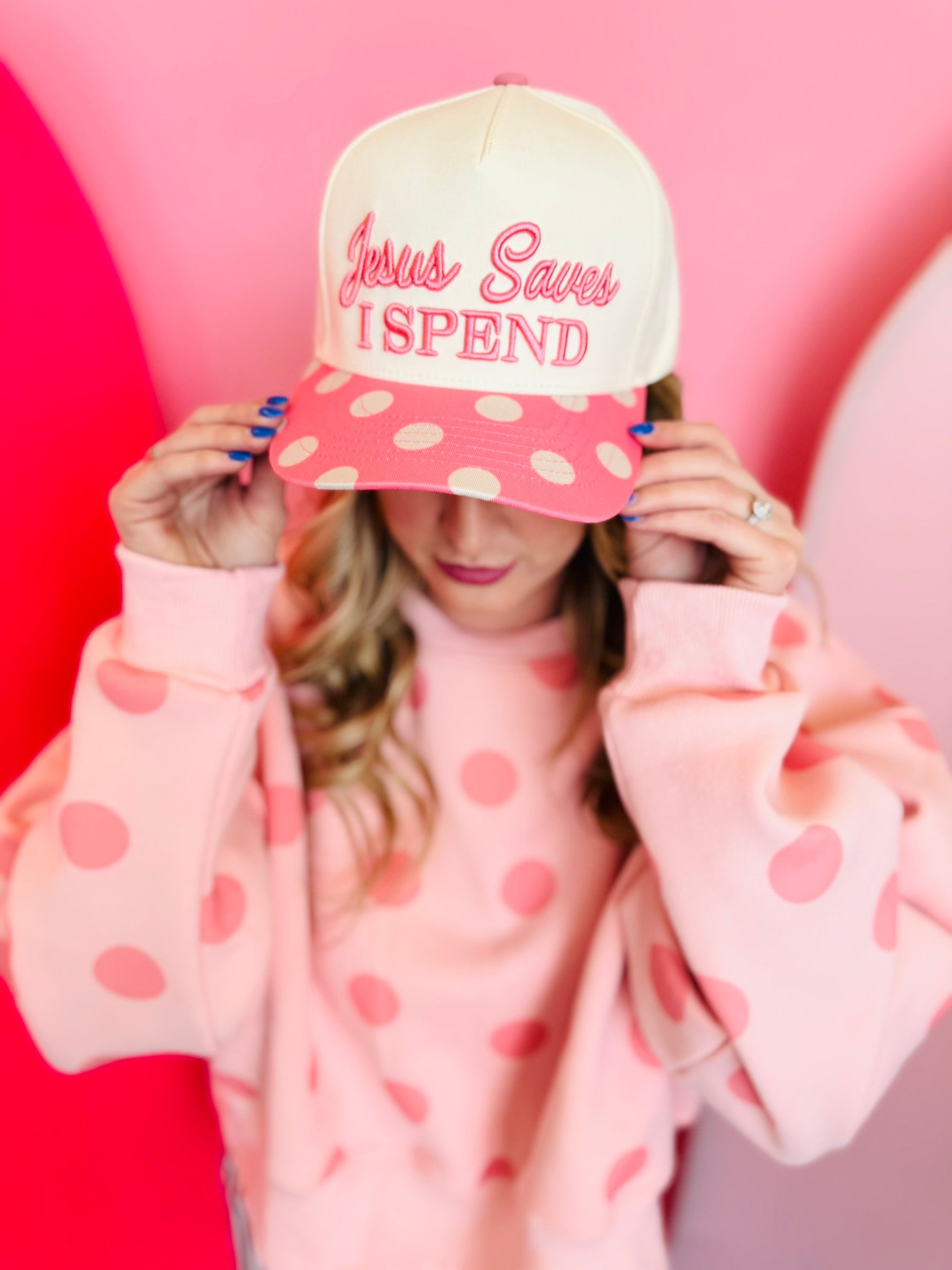 Make a faith-filled statement with a playful twist in our Jesus Saves I Spend Faith Hat. This eye-catching cap features a cream crown paired with a pink bill accented by cream polka dots, creating a fun, feminine look that stands out while remaining easy to style. Embroidered across the front in soft pink lettering is the uplifting phrase “Jesus saves I spend,” blending humor, faith, and personality in one meaningful design.