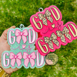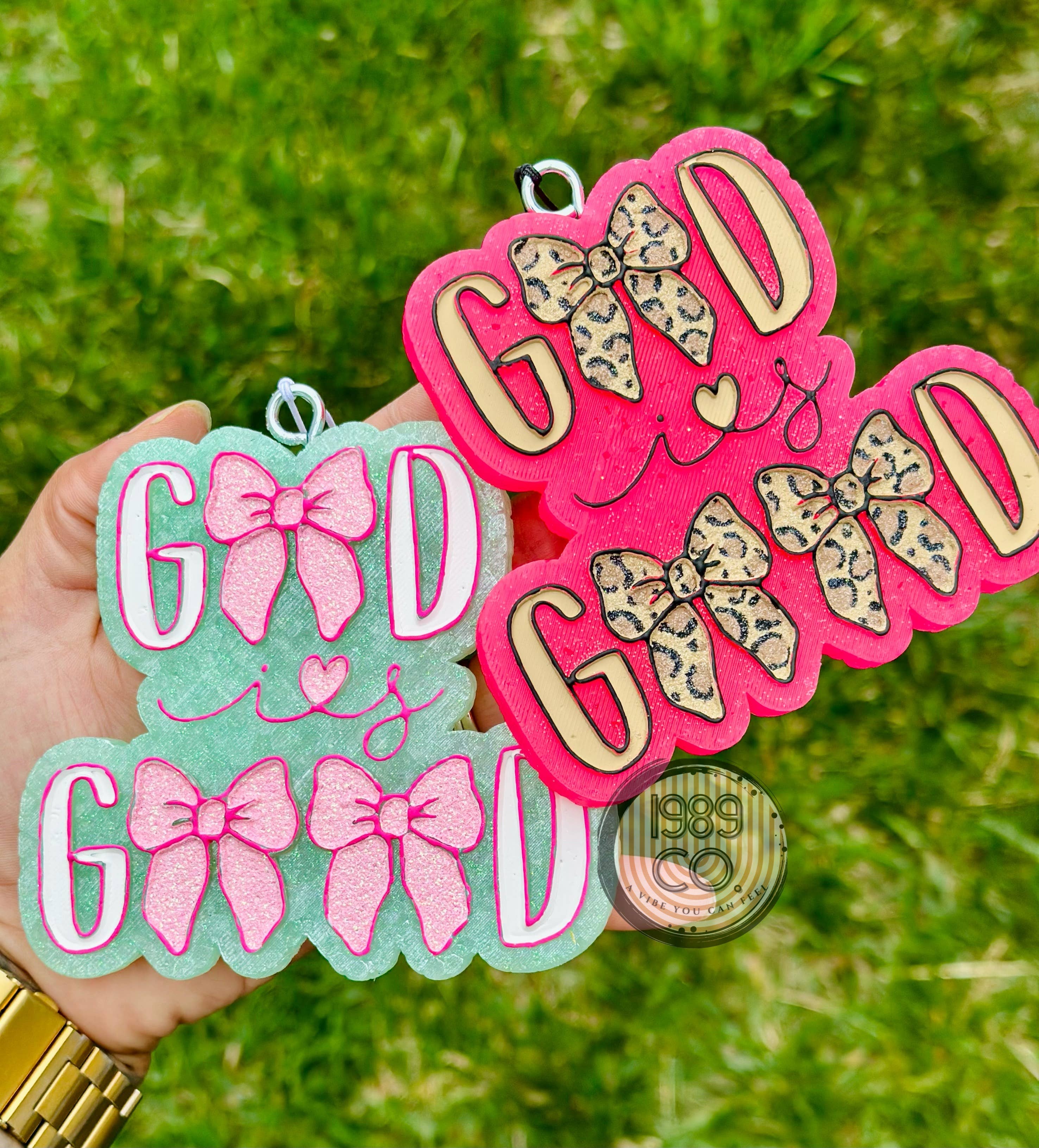 Bring encouragement, charm, and a fresh scent to your everyday drive with the God Is Good Bows Car Freshie. Featuring a sweet bow-inspired design paired with an uplifting message, this car freshie adds a meaningful touch to your vehicle while keeping it smelling clean and inviting. Designed for ease, it includes a hook-and-eye closure with string, making it simple to hang from your rearview mirror or anywhere in your car.