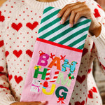 Featuring bright, multicolor “Bah Humbug” appliqué letters decked out in candy canes, bows, and Santa hats, this towel adds playful contrast to its pink background topped with teal green and white stripes. Perfect for gifting, decorating, or adding personality to your kitchen, it’s a lighthearted reminder that even Scrooges deserve a little sparkle.