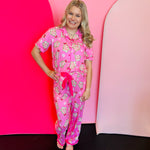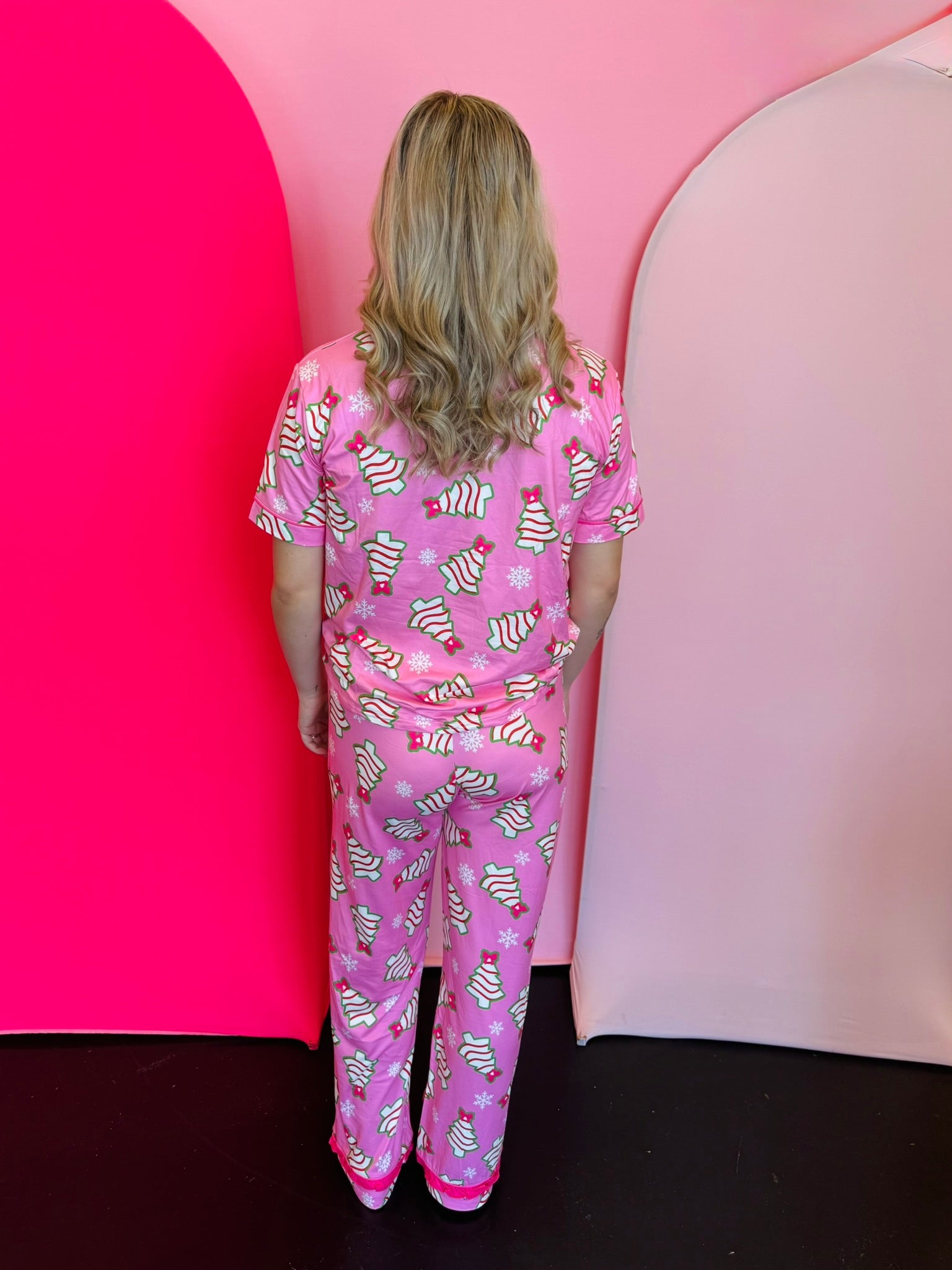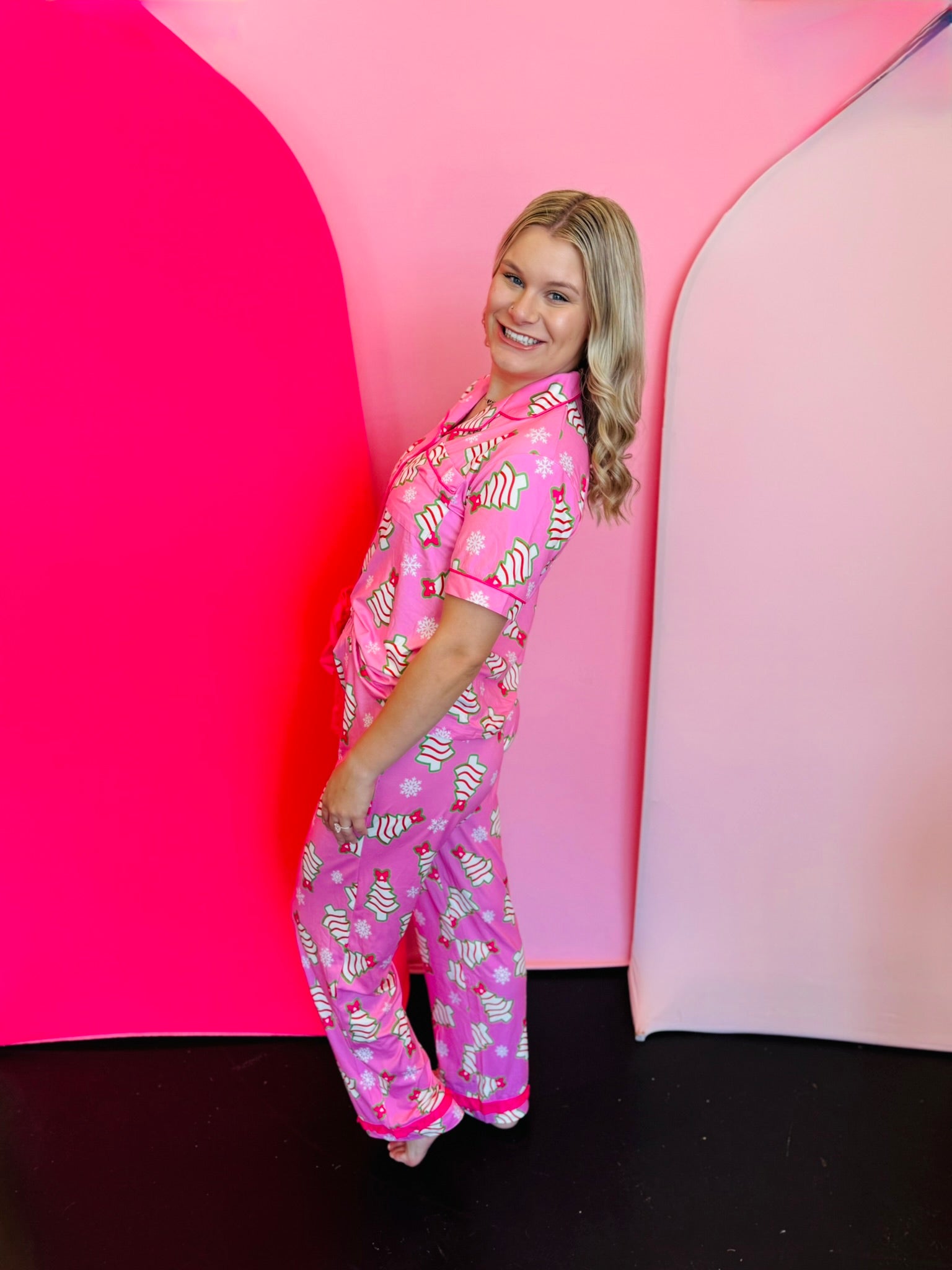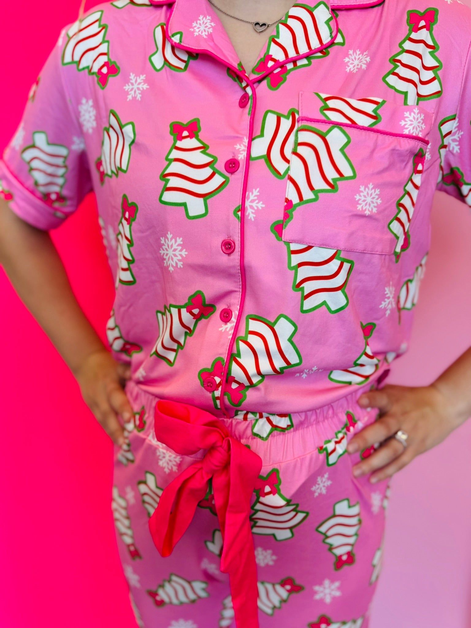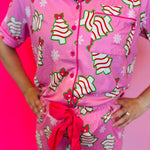 Cozy up in festive style with the Bow Christmas Treat Ruffle Pajama Set, the perfect blend of comfort and holiday cheer. This two-piece set features a bright pink background covered in playful Christmas tree treats topped with pink bows and sprinkled with white snowflakes, adding a whimsical touch to your winter nights. The short-sleeve, button-down top pairs effortlessly with matching drawstring pants, both trimmed with subtle ruffle accents for a feminine finish.