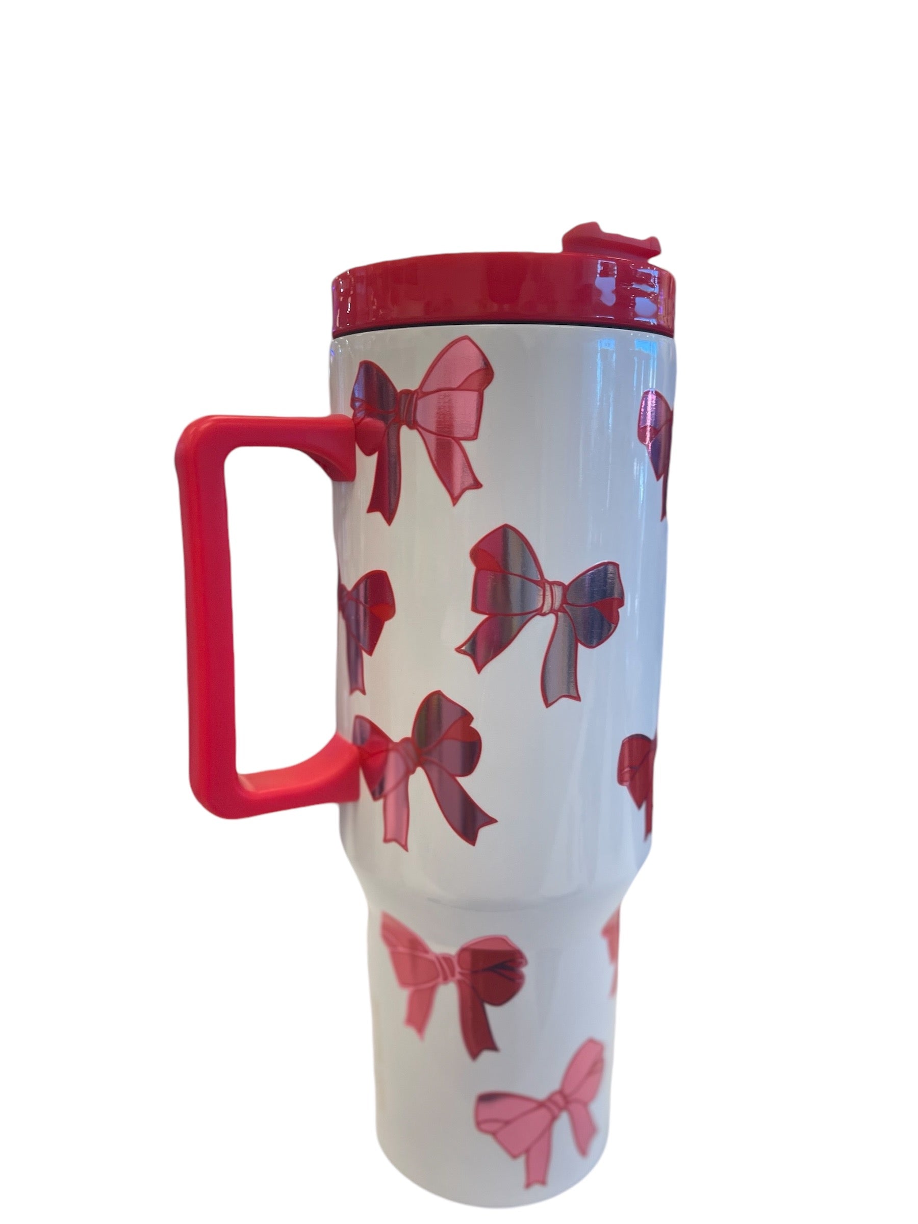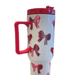 This bow-tastic tumbler holds a whopping 40 oz, perfect for all your on-the-go hydration needs. With adorable red and pink bows and a matching lid and handle, it's a stylish and functional addition to any ensemble. Stay hydrated and chic with the Bow Tumbler!