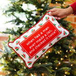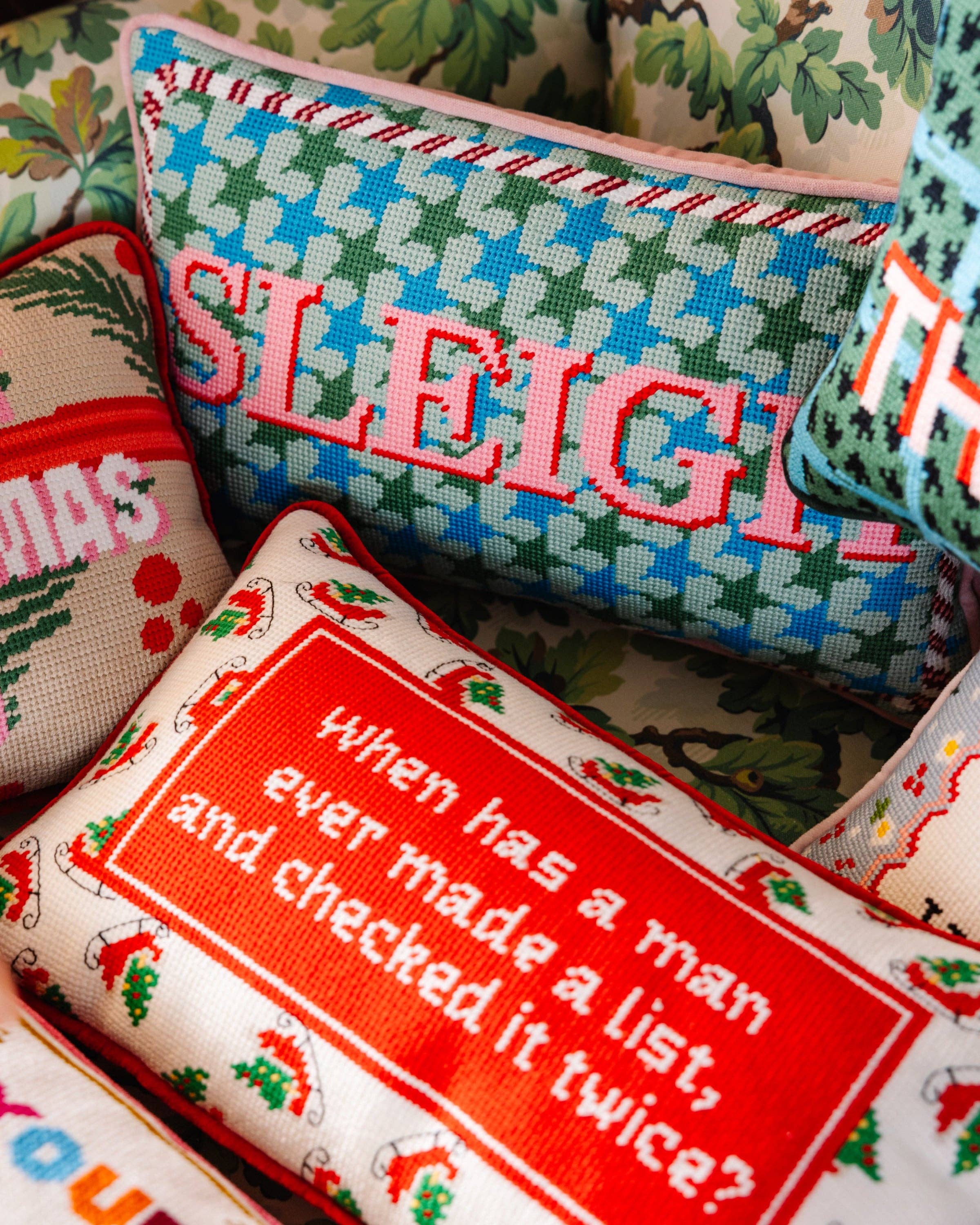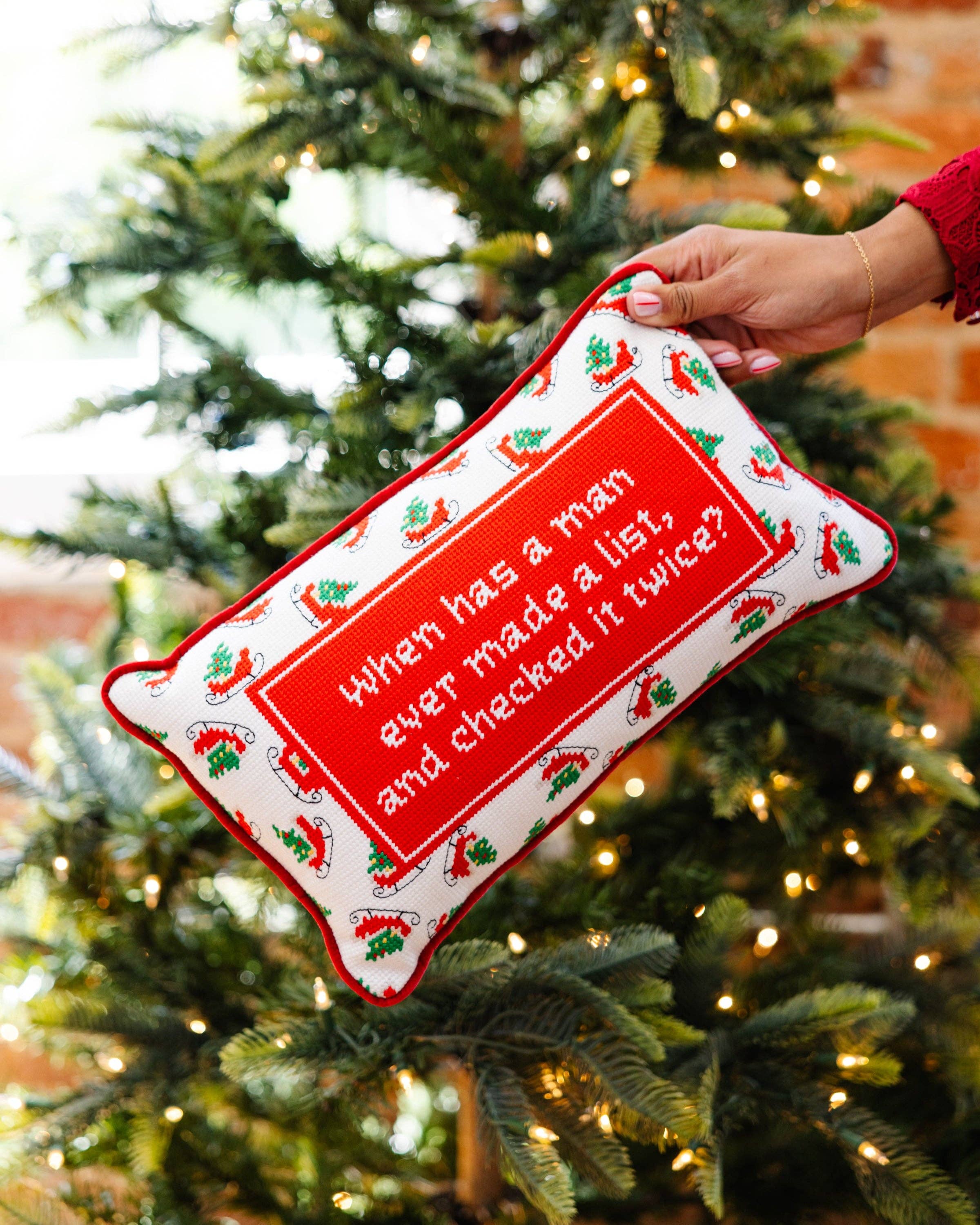 Add a touch of humor and holiday cheer to your decor with the Check It Twice Needlepoint Pillow — the perfect accent for those who truly run the season. Featuring a playful red center that reads, “When has a man ever made a list, and checked it twice?”, this small pillow makes a big statement. The rectangular design is framed with classic Christmas motifs like holly leaves and sleighs, all beautifully hand-embroidered and backed with luxurious velvet for a soft, high-end finish. Perfect for gifting or displaying, it’s a charming reminder of who’s really checking that list twice.