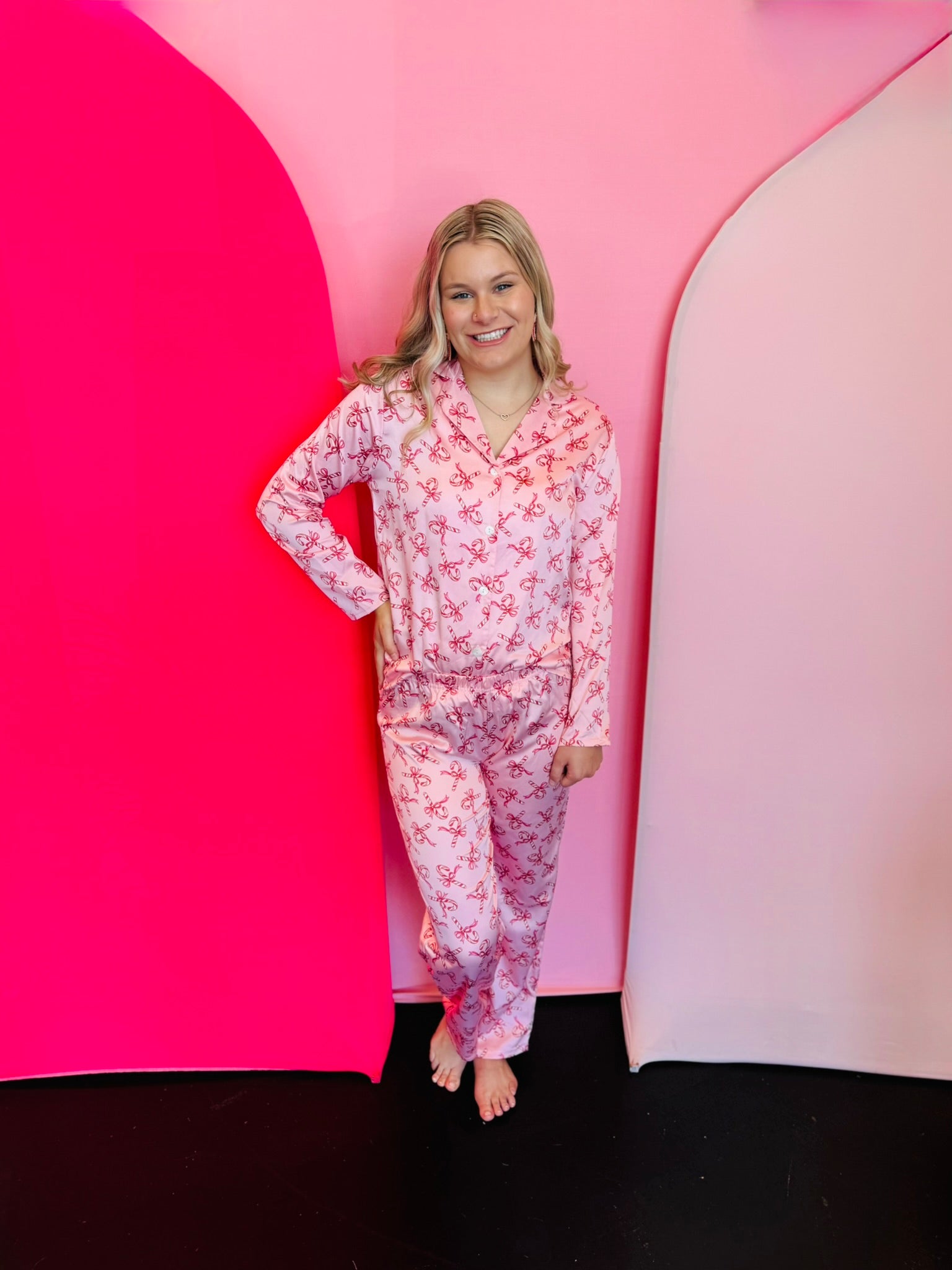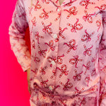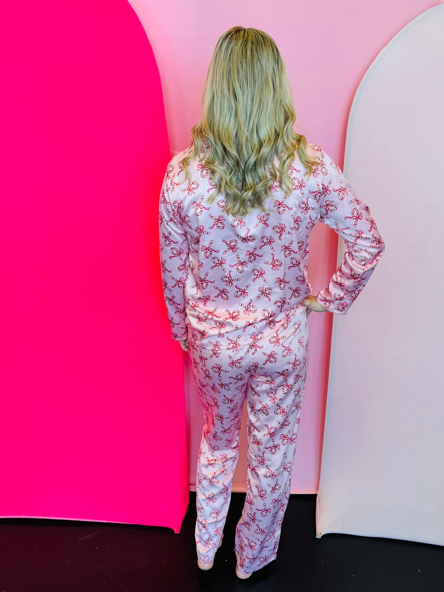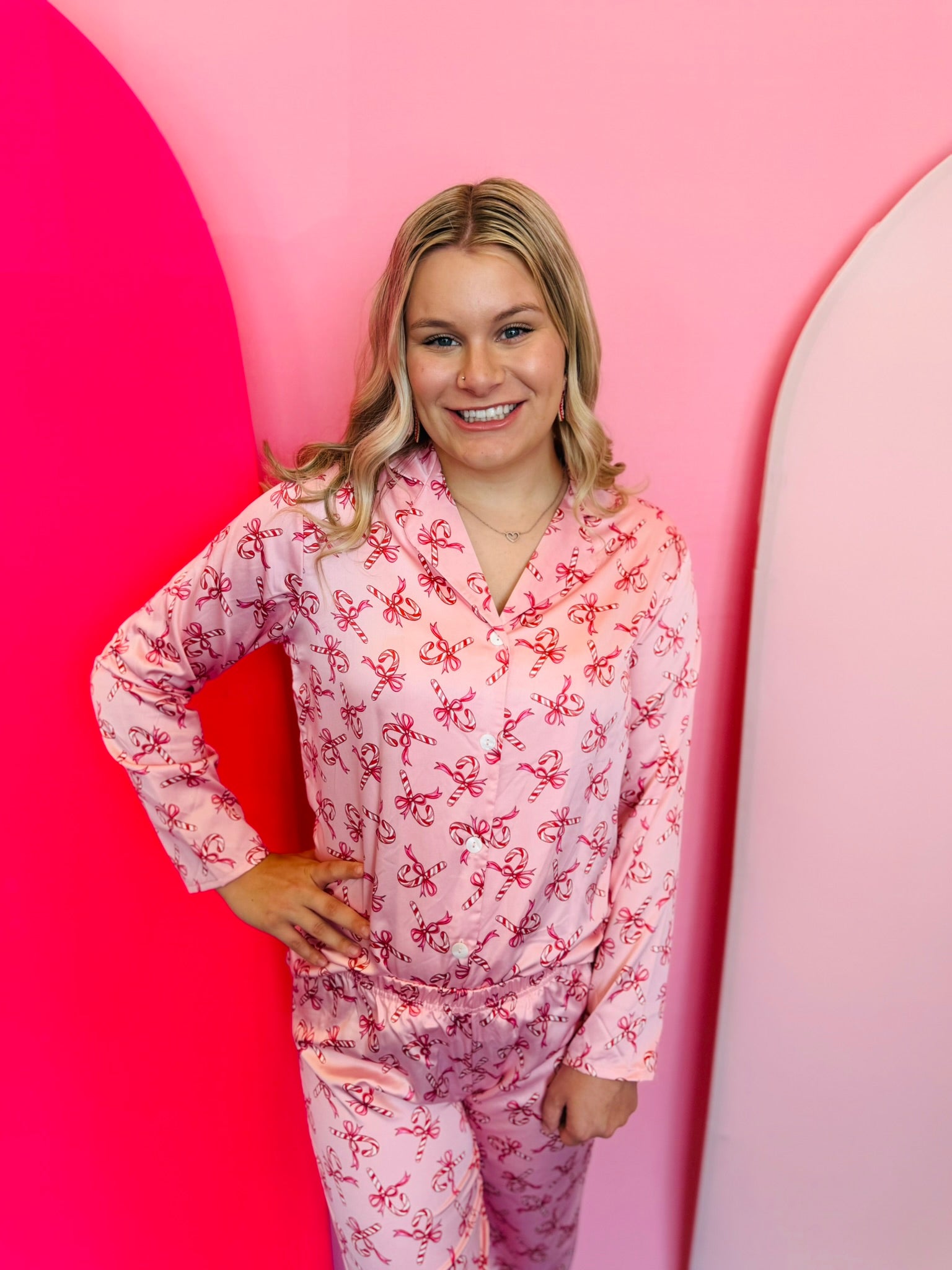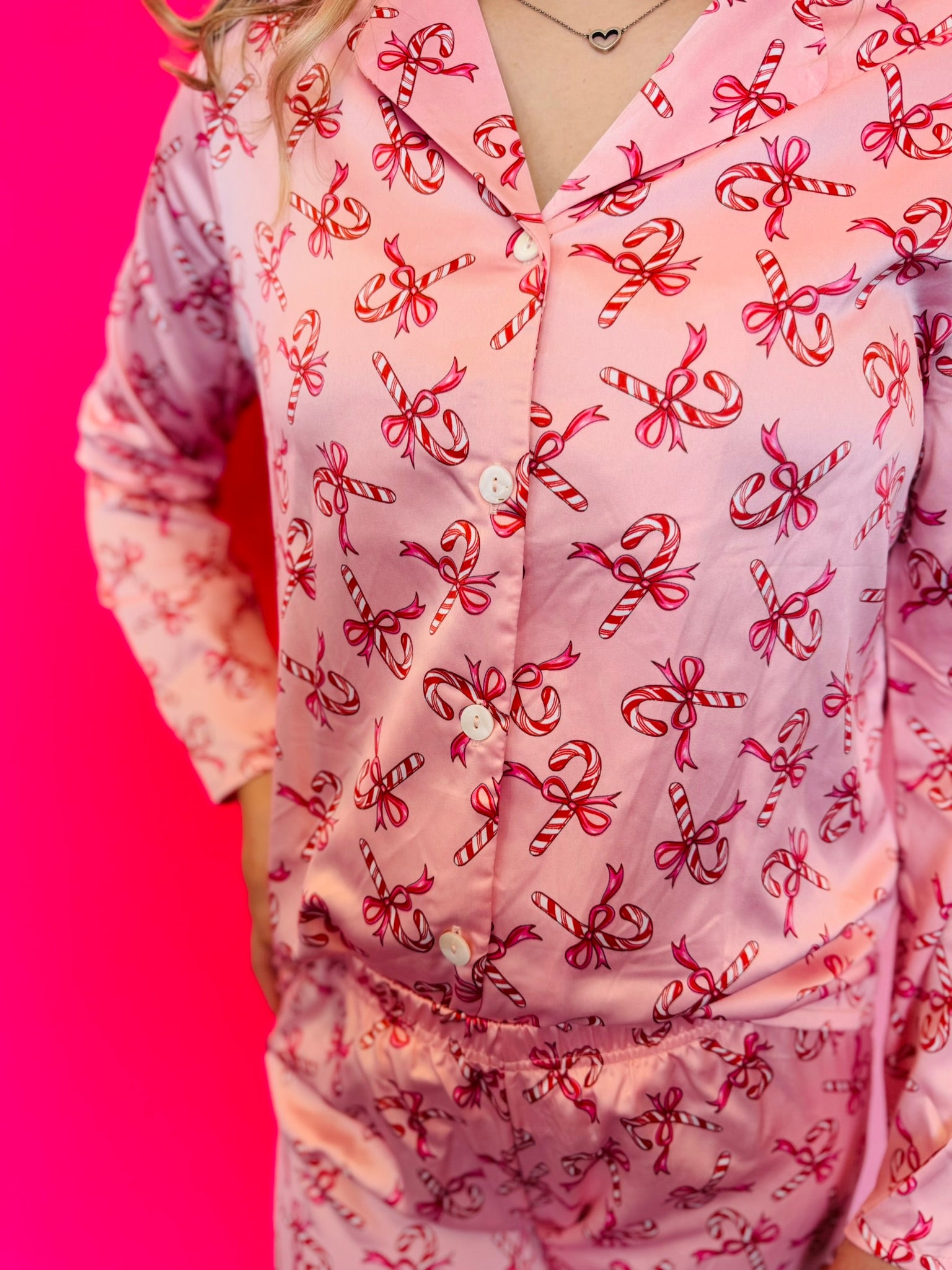 Drift into sweet holiday dreams with our Candy Cane Pajama Set. This adorable set features a classic button-up, long-sleeve top and matching pants, both crafted from a silky, satin-like fabric. The charming design showcases a beautiful, soft pink background adorned with a delicate, all-over print of tiny red candy canes and sweet bows. This set offers a luxurious feel with a hint of stretch for the perfect, cozy fit. It is the perfect attire for festive lounging and cheerful holiday mornings.
