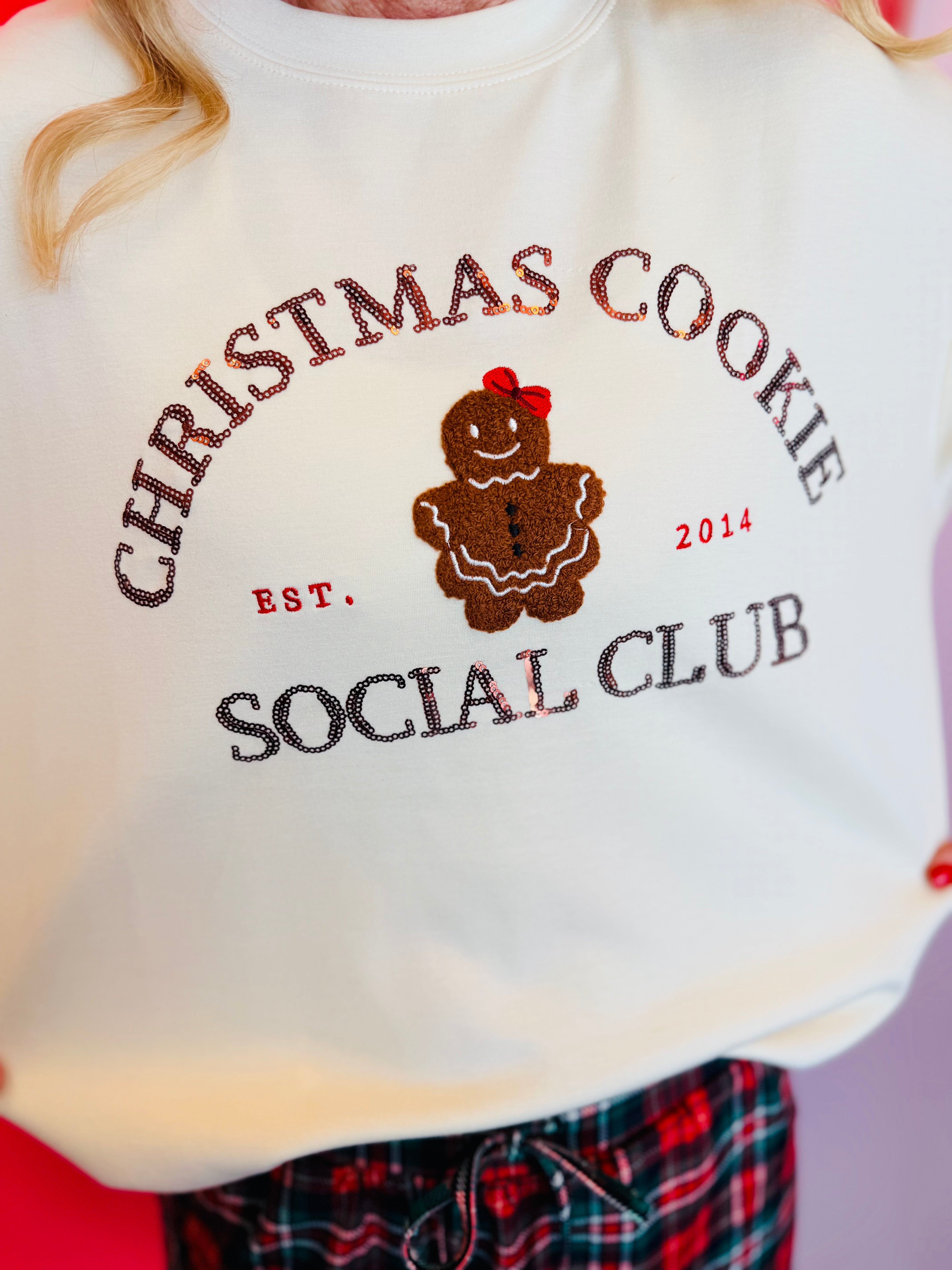 Cream pullover with Christmas Cookie Social Club gingerbread graphic.