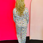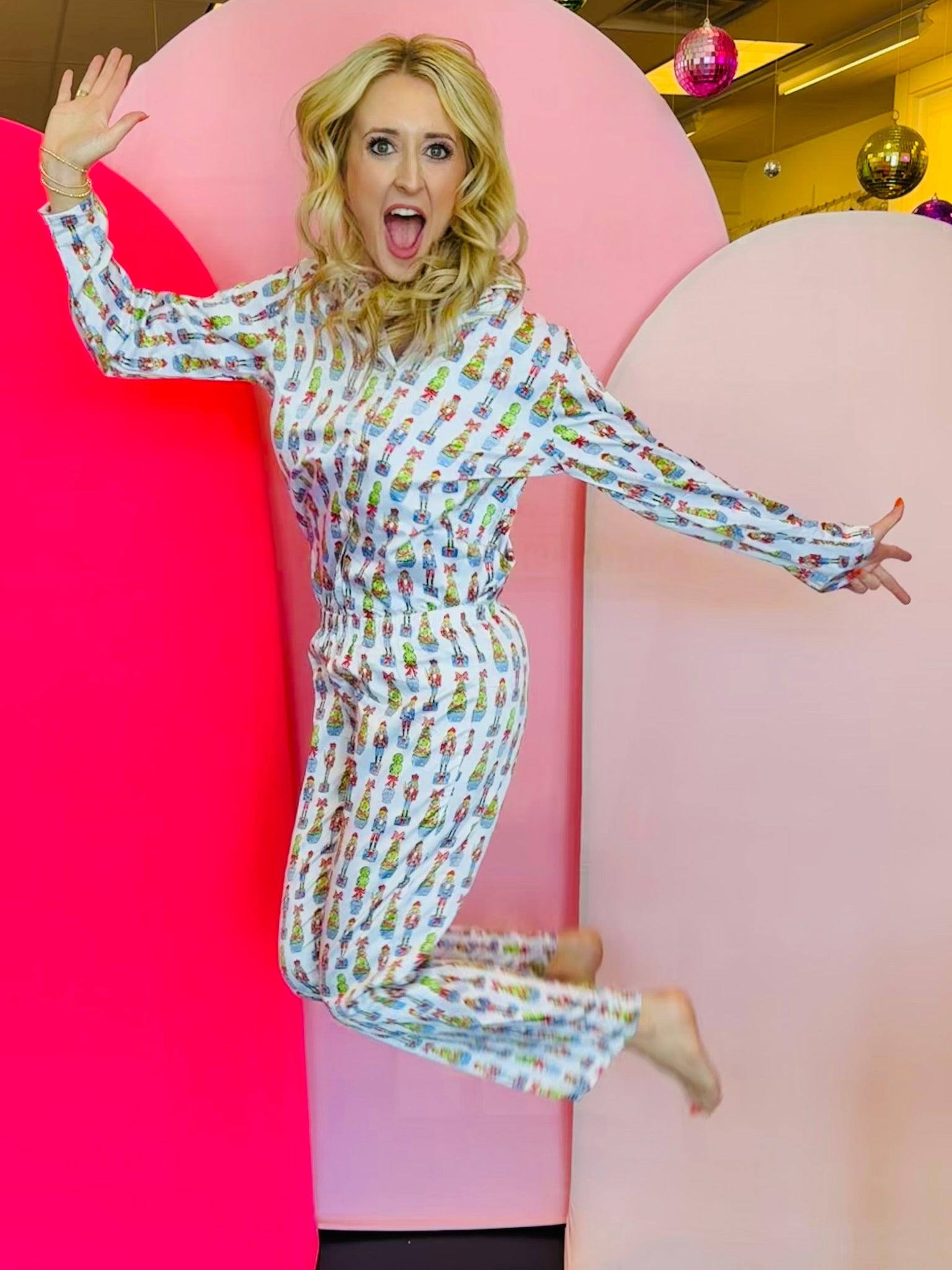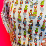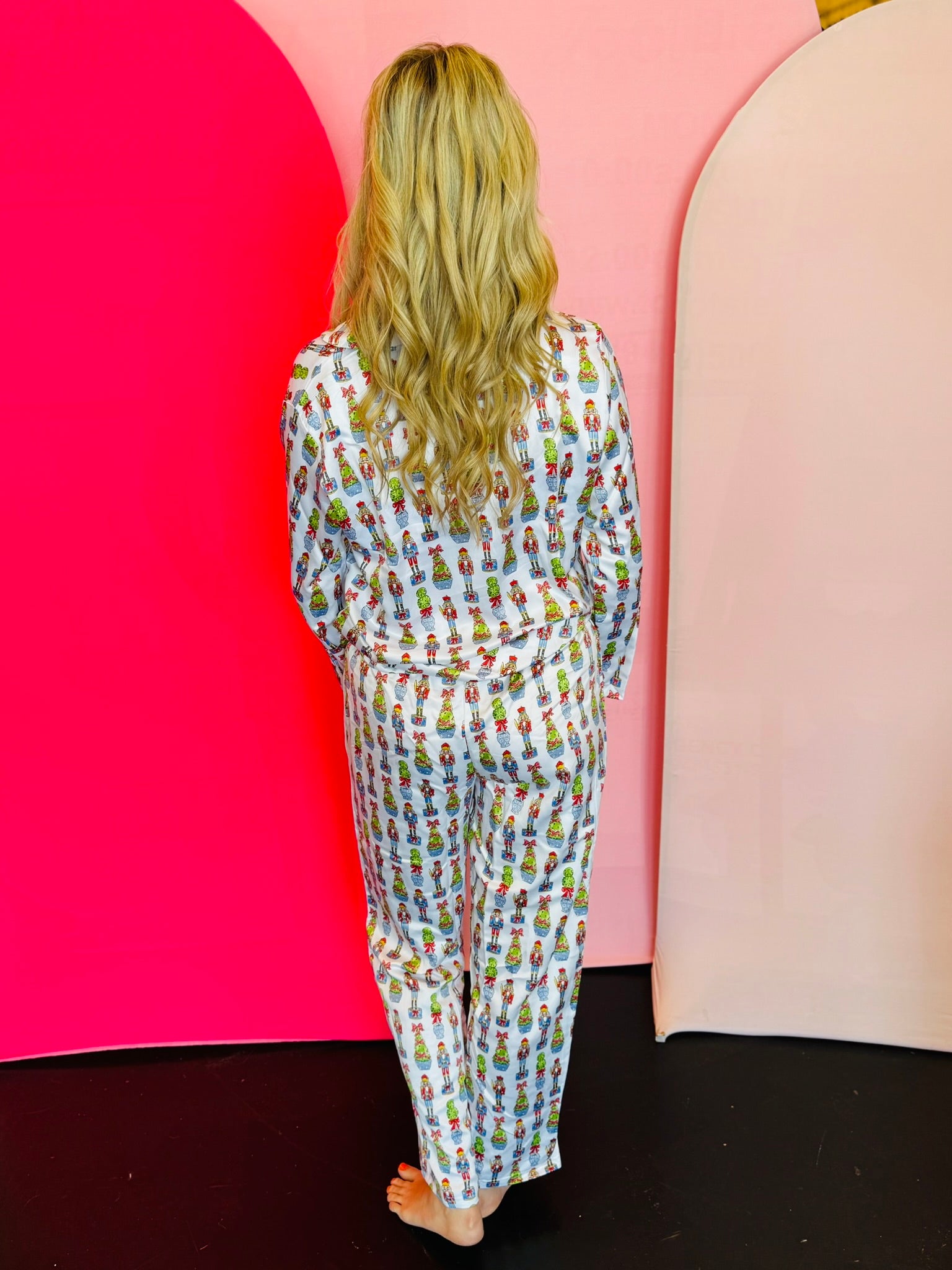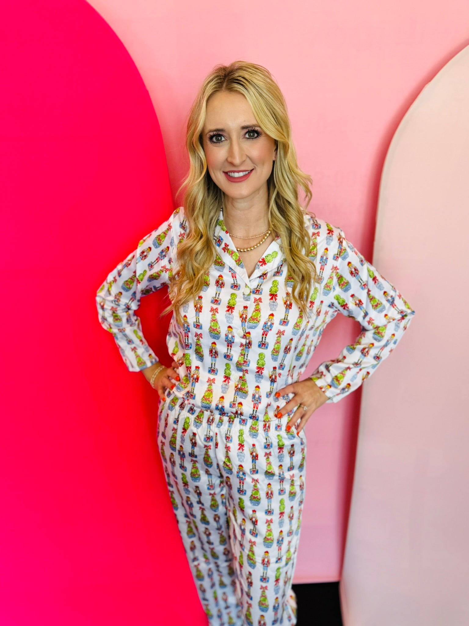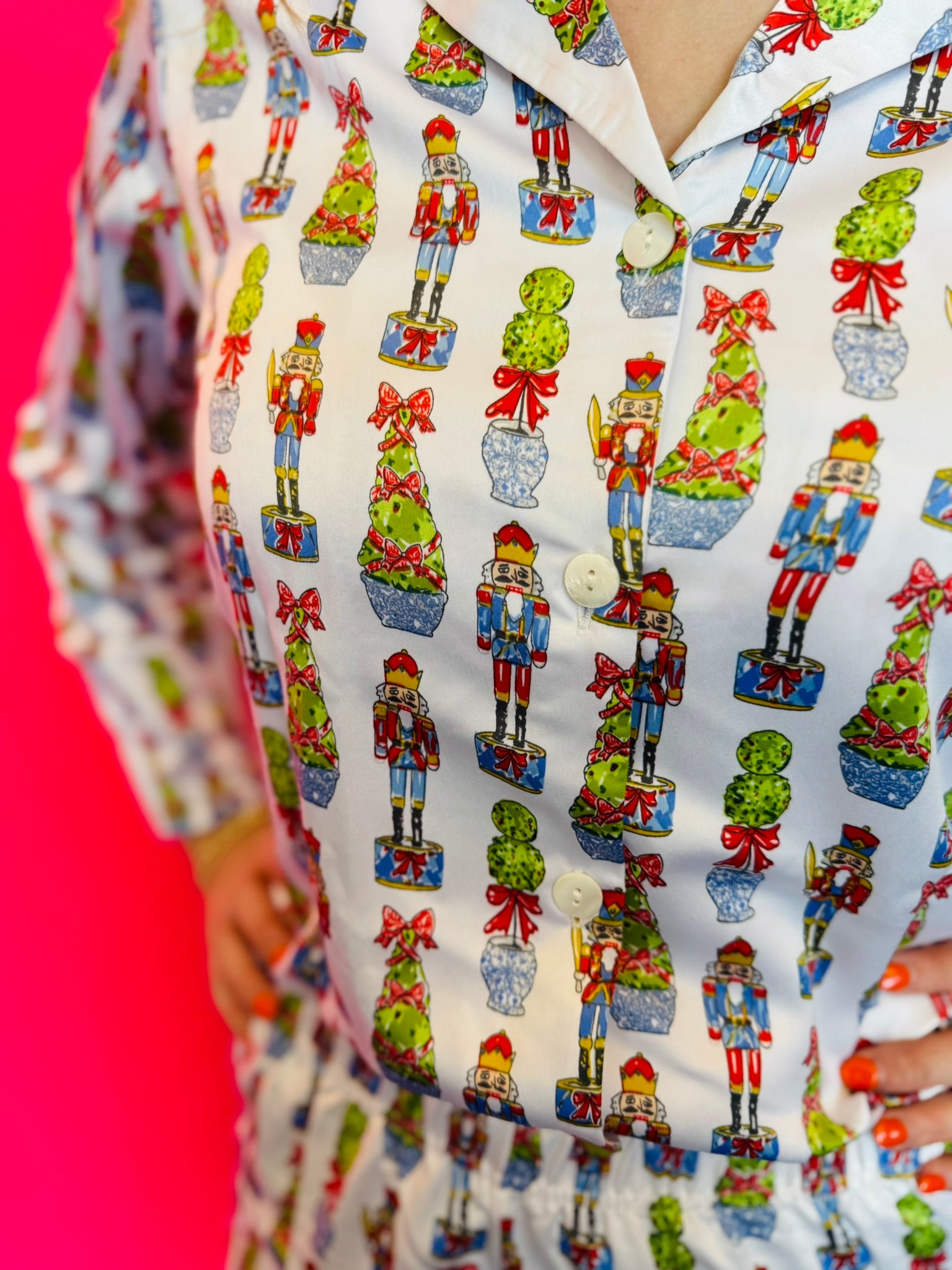 Dance into sweet holiday dreams with our Nutcracker Pajama Set. This enchanting set features a classic button-up, long-sleeve top and matching pants, both crafted from a silky, satin-like fabric. The festive design showcases a beautiful, all-over print of colorful, classic nutcracker soldiers, bringing a touch of holiday magic to your bedtime. This set offers a luxurious feel with a hint of stretch for the perfect, cozy fit. It is the perfect attire for festive lounging and magical Christmas mornings.