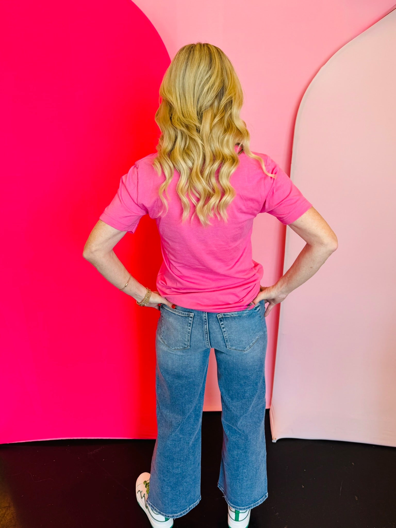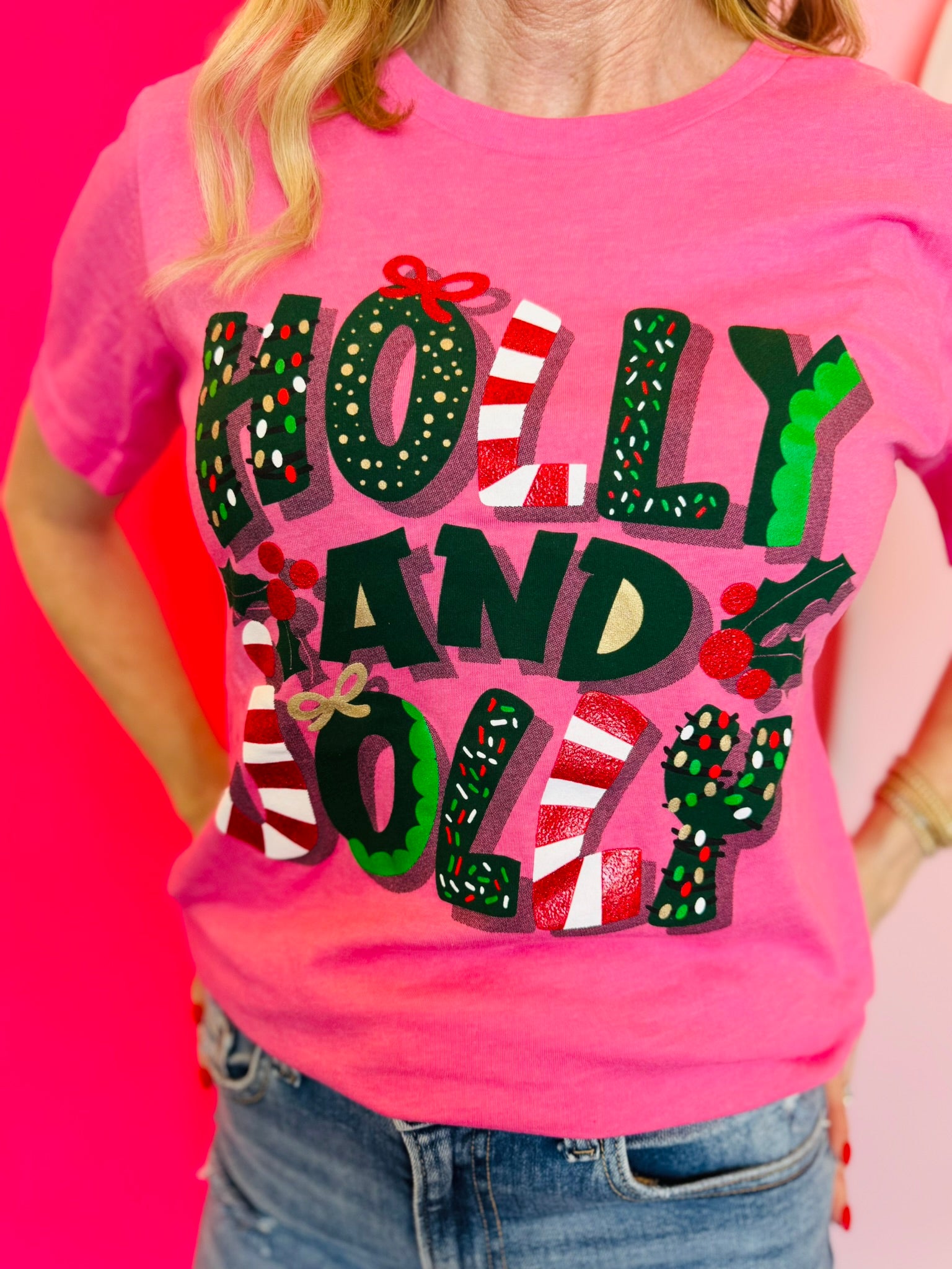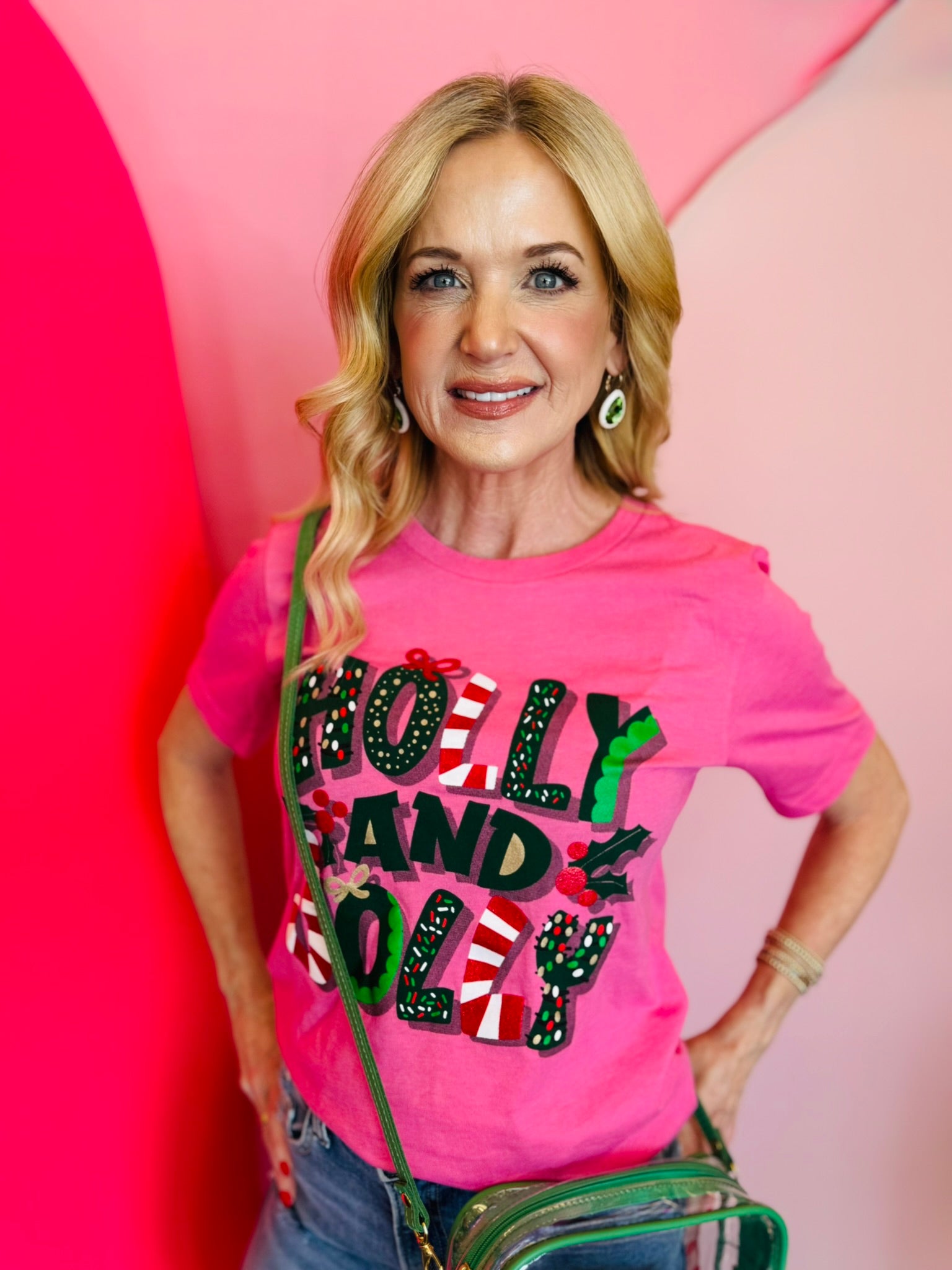 Shine bright this season with the Holly and Jolly Tee, a festive favorite made to spread sparkle and cheer! This bright pink graphic tee features playful “Holly & Jolly” lettering in green, red, and white, adorned with glitter accents, candy cane stripes, polka dots, and holly details for extra holiday magic. Crafted from a soft and breathable 52% cotton and 48% polyester blend, it offers a comfortable, relaxed fit that’s perfect for layering or wearing on its own. Whether you’re wrapping gifts, attending a holiday gathering, or just showing off your Christmas spirit, the Holly and Jolly Tee adds the perfect touch of sparkle to your festive wardrobe.