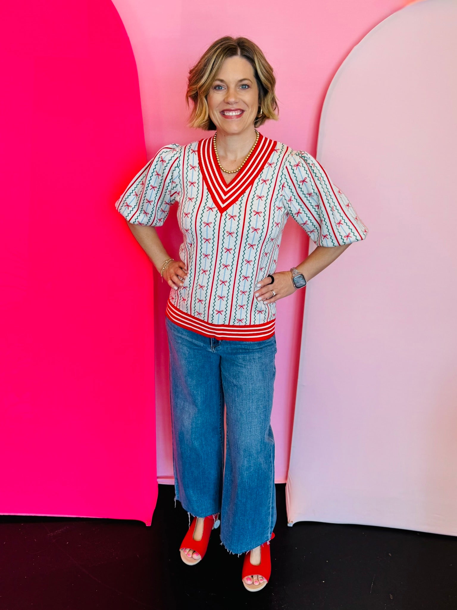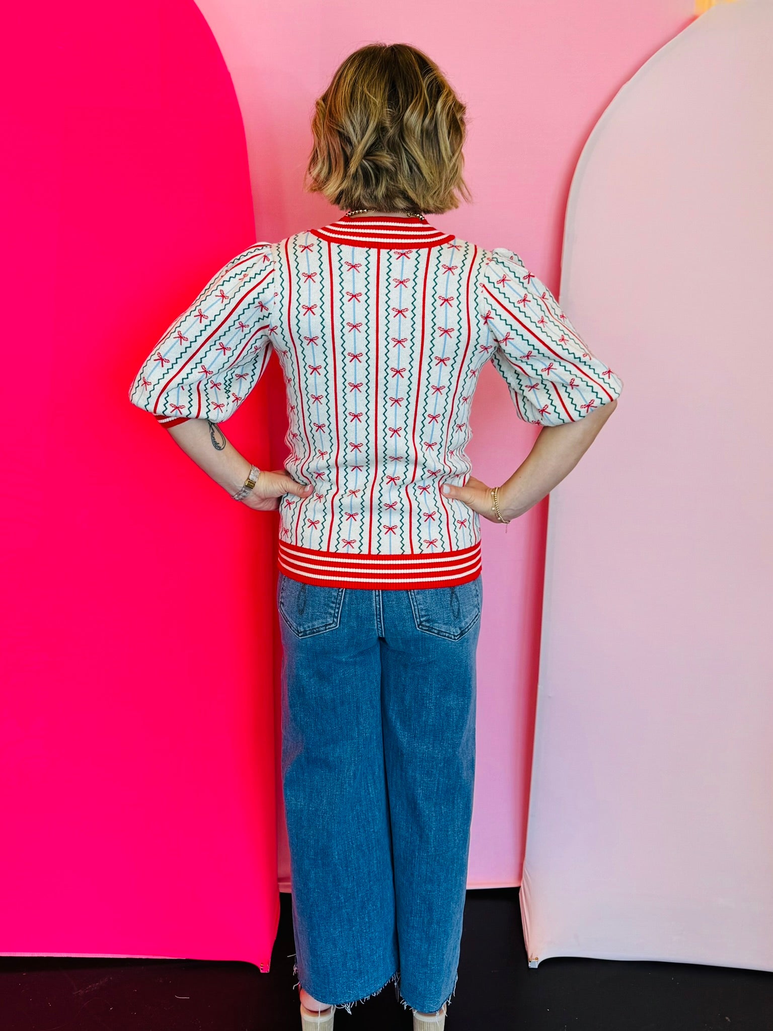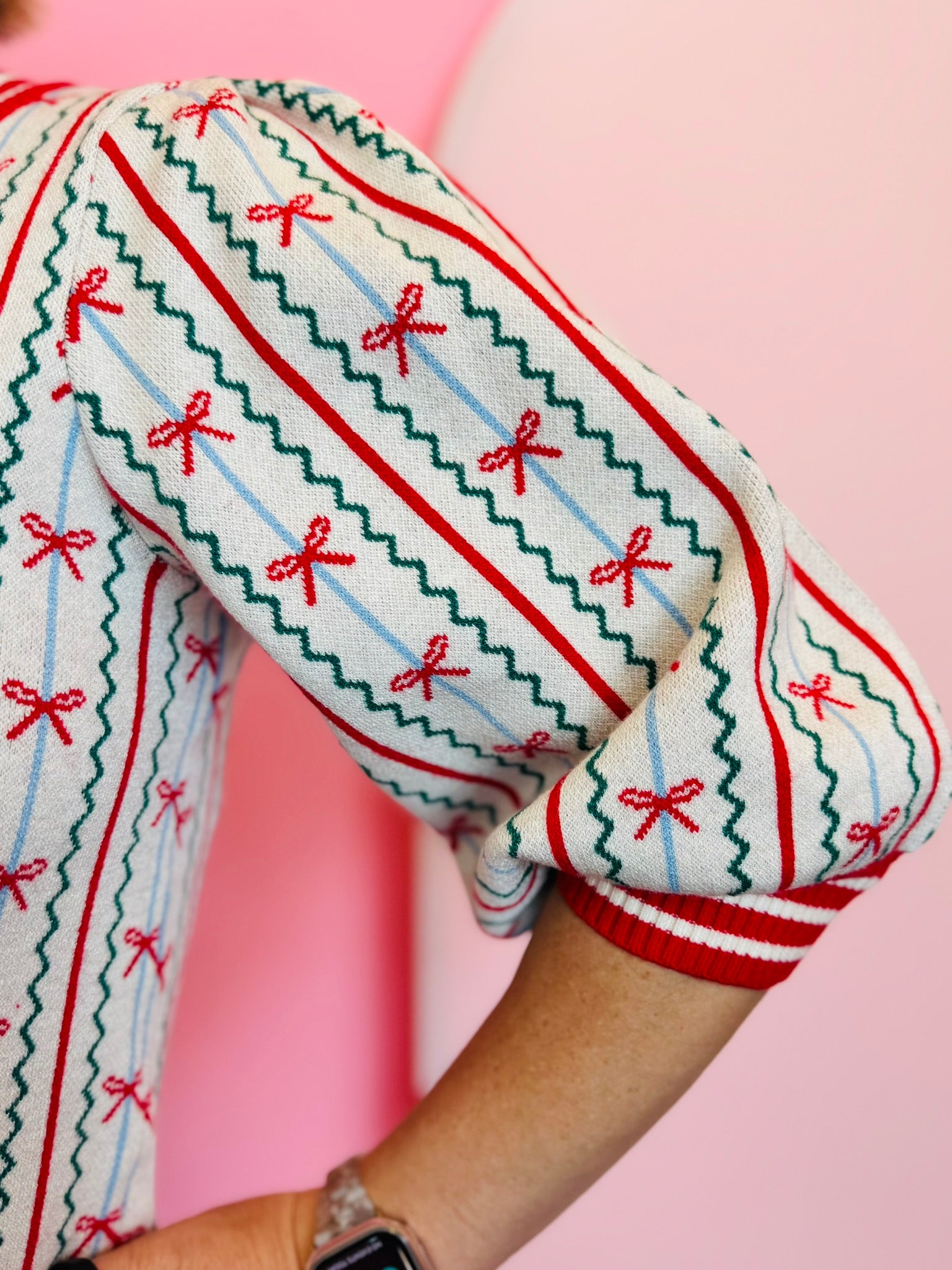 Embrace charming style with our Faith In A Bow Sweater! This delightful knit top features intricate zigzag patterns forming a vibrant red bow design, beautifully set against a classic cream background. The sweater is finished with bold red and white striped trim, elegantly adorning the neckline, sleeves, and hem. This eye-catching detail provides a playful yet sophisticated touch. Crafted from a soft blend for ultimate comfort, it’s perfect for adding festive flair or unique charm to your everyday wardrobe.