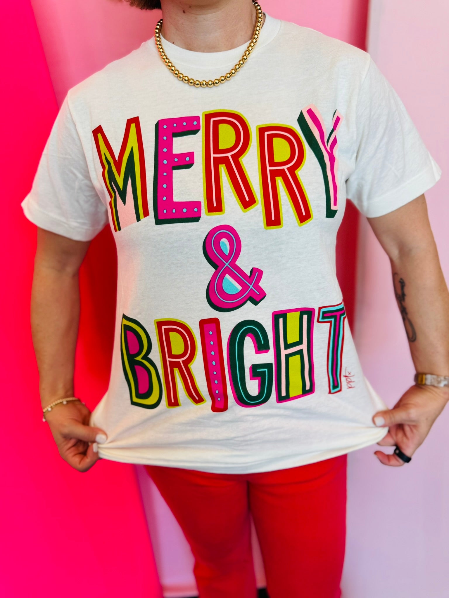 A vintage white t-shirt with "Merry & Bright Whimsy" in colorful, playful lettering.
