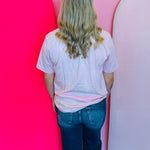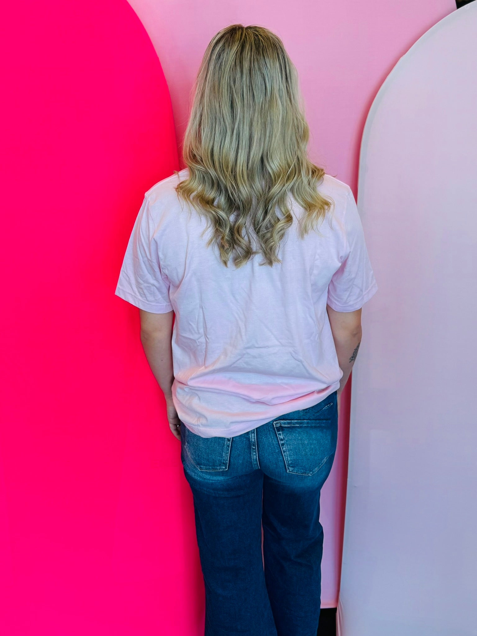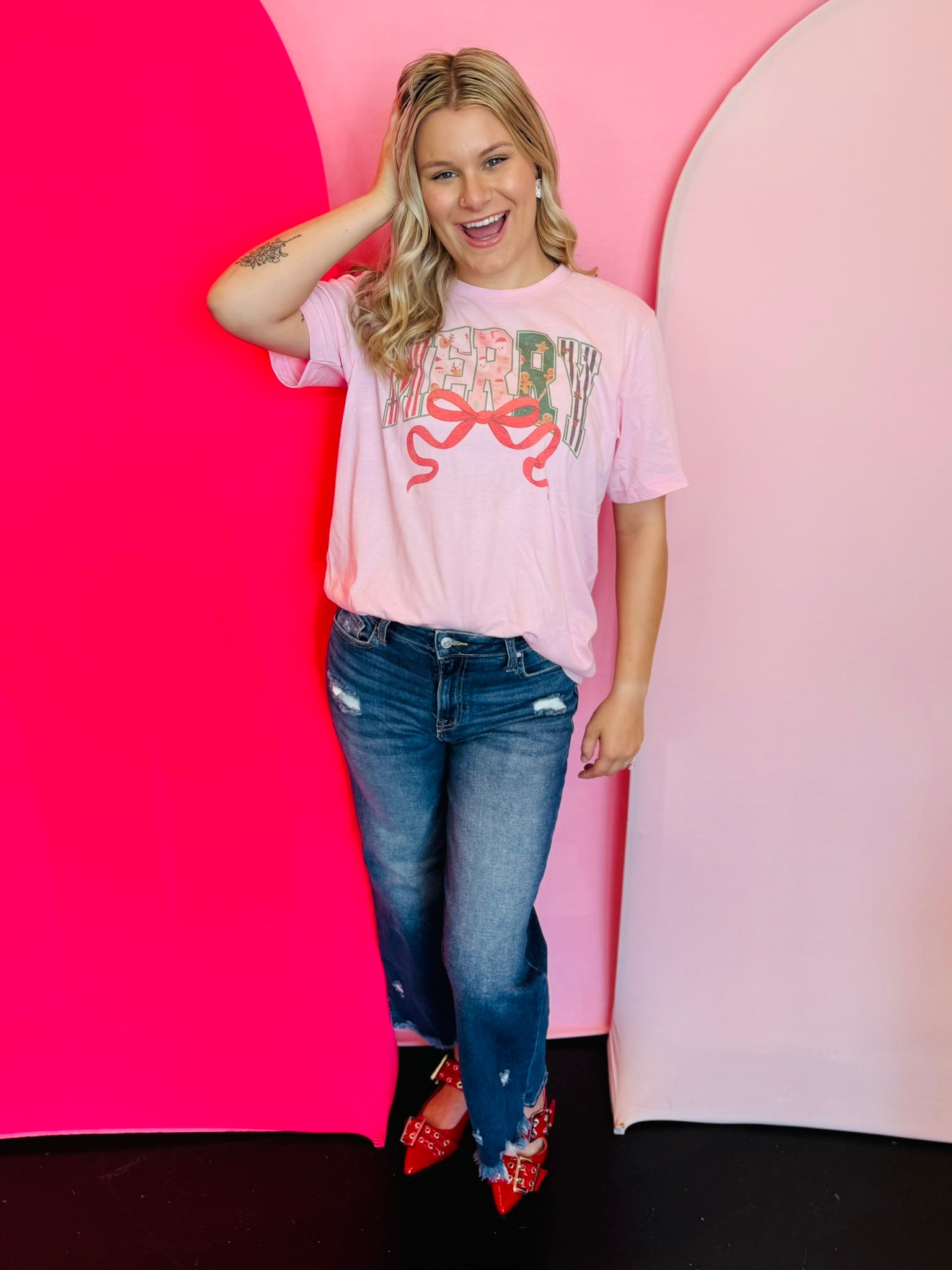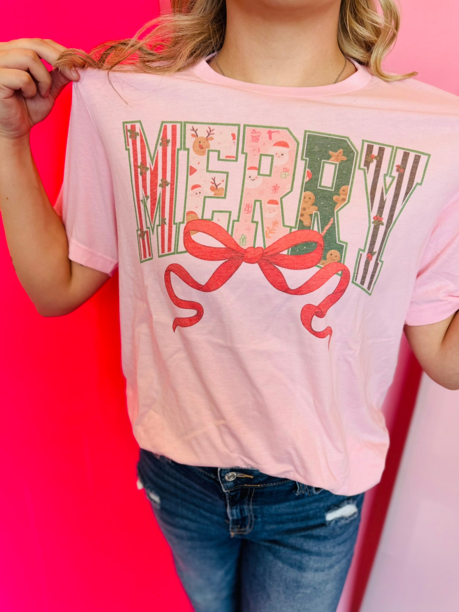 Get ready to be merry and bright with our Merry Pink Bow Tee! This festive t-shirt features a cheerful pink background, making it a fun choice for the holiday season. The star is the bold word "MERRY" across the front, uniquely filled with a playful pattern of tiny reindeer, gingerbread men, and stars. The entire design is perfectly topped off with a big, bright red bow. Crafted from a soft and comfortable blend, it is a must-have for spreading holiday cheer in style.