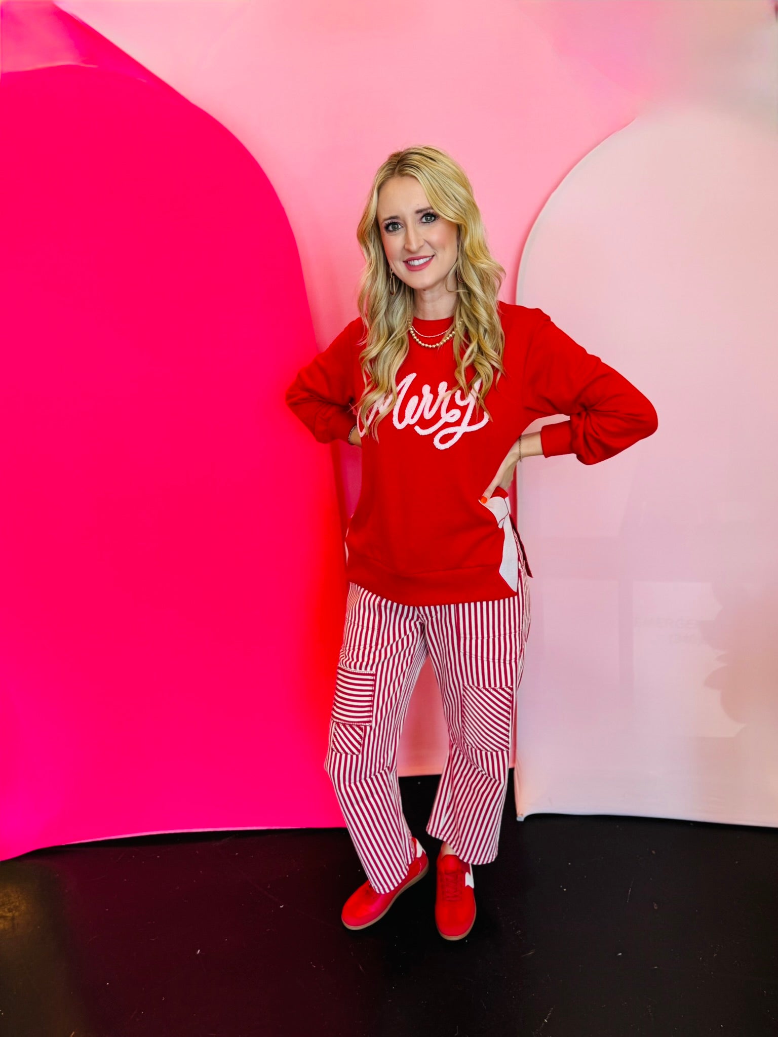 Embrace festive charm with our Red Merry Bow Sweatshirt! This vibrant red sweatshirt makes a cheerful statement, featuring bold white chenille lettering that spells out "Merry" across the front. The soft, textured lettering creates an eye-catching focal point, while playful bow accents on the sides add a delightful and unique touch. This cozy top ensures both warmth and a flattering fit for all your seasonal celebrations. It’s perfect for casual holiday gatherings or infusing your everyday style with joyous spirit.