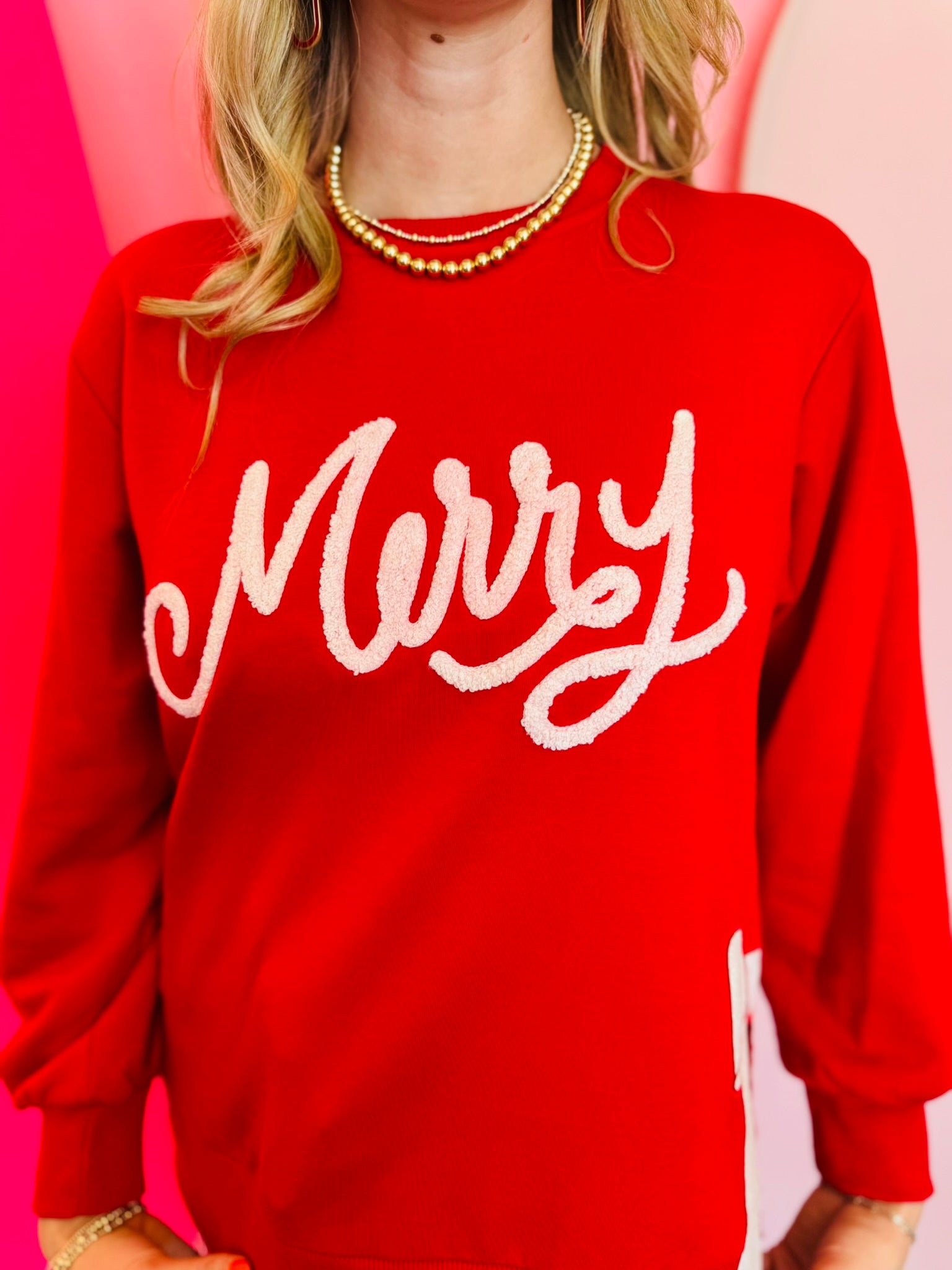 Bold White Chenille Lettering: Soft, textured "Merry" across the front.