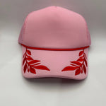 Pink Captains Hat with red embroidered bill & red rope accent. Our Captains Hat is a foam front trucker, has a mesh back, and an adjustable snapback enclosure. Perfect for your next hat bar, pressed patches, or for embroidery. Don't forget a trucker hat chain for a great add on to your finished product!