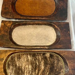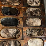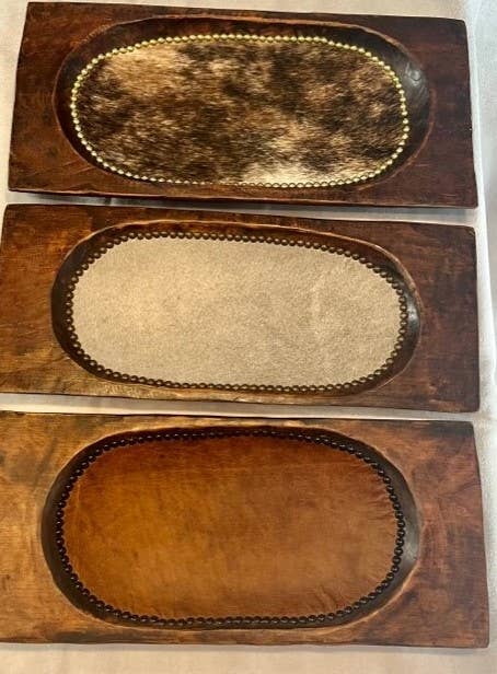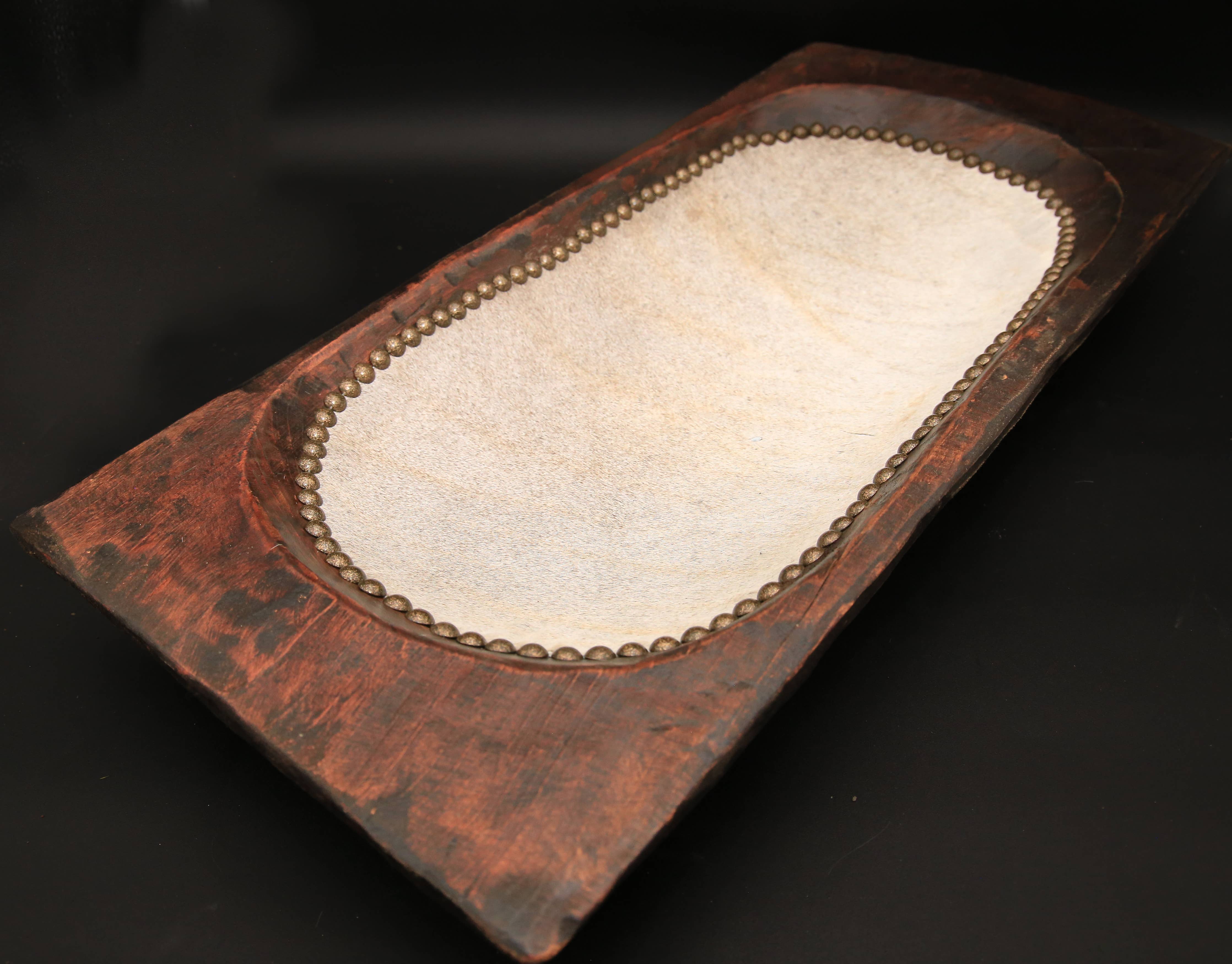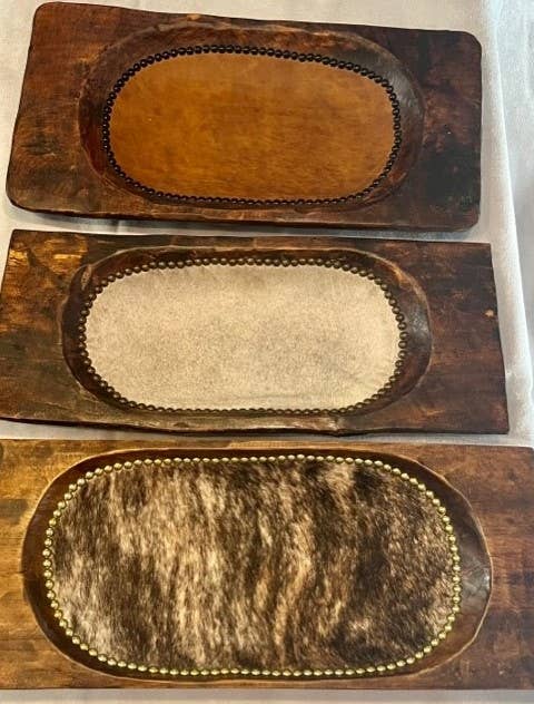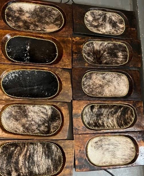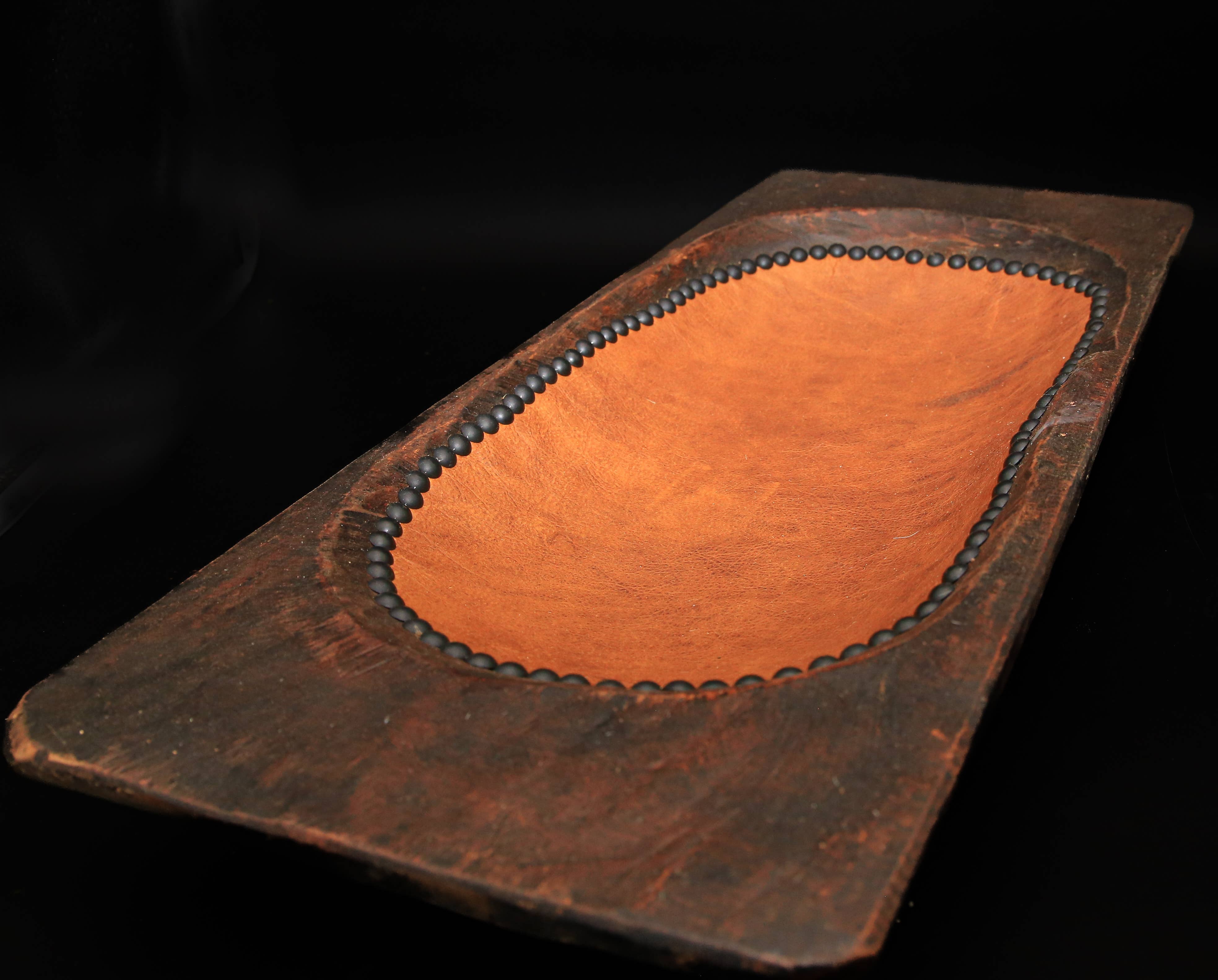 A Classic Dough Bowl made with real Spanish Oak that has been beaded with real leather and cowhide from Brazil.