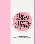 "Spice up your kitchen with the Bless Your Heart Dishtowel. This white tea towel features quirky pink and black graphics that are sure to make you smile while you clean. A fun and playful addition to any kitchen!"