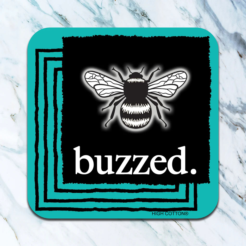 Our coasters are made in the USA from absorbent, neoprene-like material and measure 4" x 4". They are dishwasher safe and reusable (what a deal).