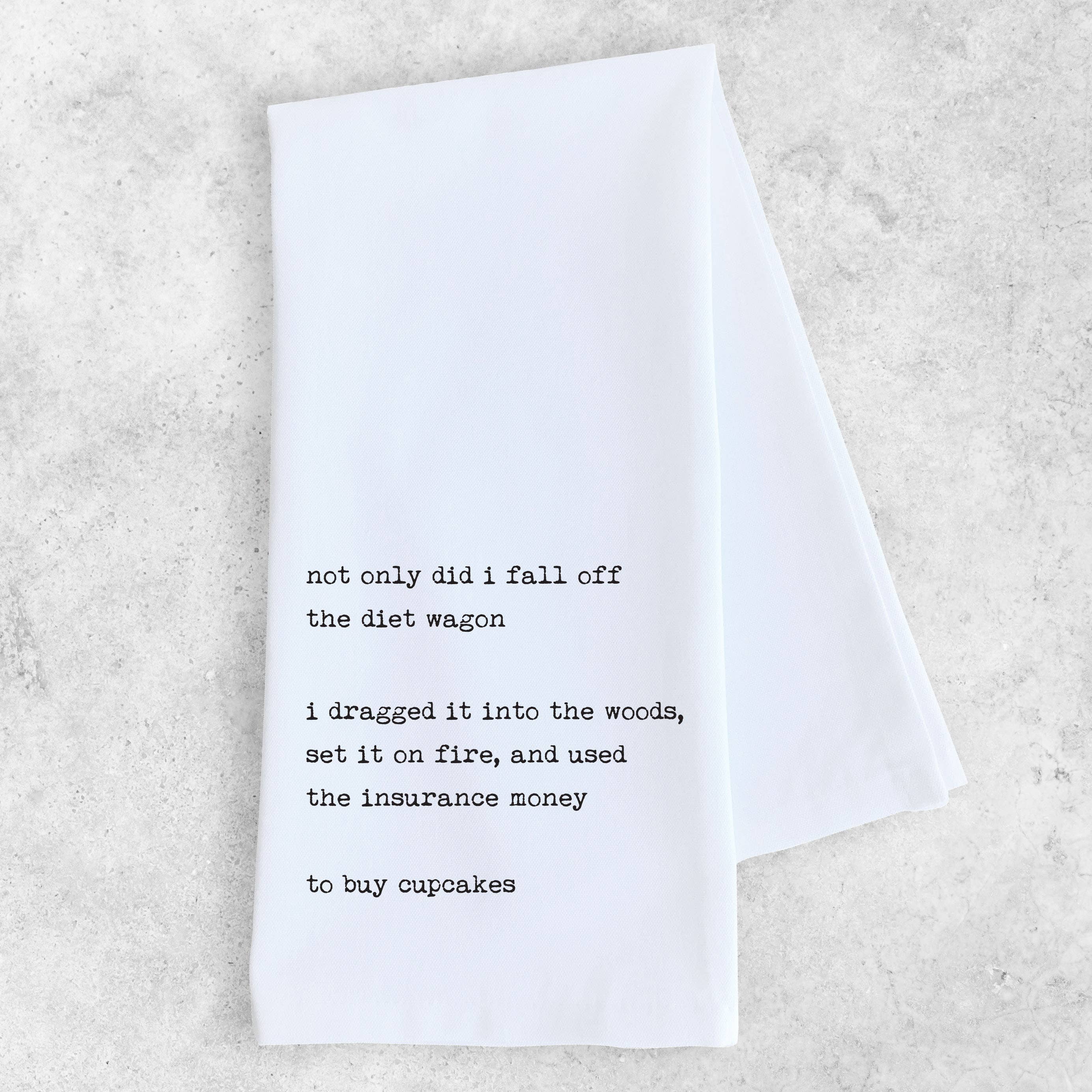 "Indulge your sense of humor and kitchen decor with our I Fell Off The Diet Wagon tea towel. This towel boasts a reminder to not take ourselves too seriously - even when it comes to diets. Made from high-quality material for a practical and playful addition to your home."