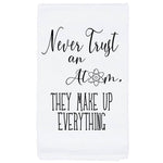 Wrap your kitchen in charm with our Never Trust An Atom Tea Towel! Made from 100% cotton, this quirky towel features a tri-fold design and a hanging loop for convenient use. And don't forget to wash away those spills - it's durable and easy to clean. Trust us, it's the perfect addition to any kitchen (just don't trust the atoms).
