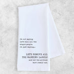 "Spice up your kitchen with our Remove All The Warning Labels Tea Towel! Quirky and playful, this tea towel features a thought-provoking message: 'I'm not saying let's kill all the stupid people. I'm just saying...Let's remove all the warning labels and let the problem sort itself out.' Embrace the humor and make a statement with this tea towel!"