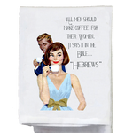 Rev up your kitchen decor with our All Men Should Make Coffee Tea Towel. This 20"x20" flat towel, made of white 100% polyester, is both decorative and functional. Machine washable and can be ironed, it's perfect for any coffee-loving household. Designed and pressed in Louisiana, USA.