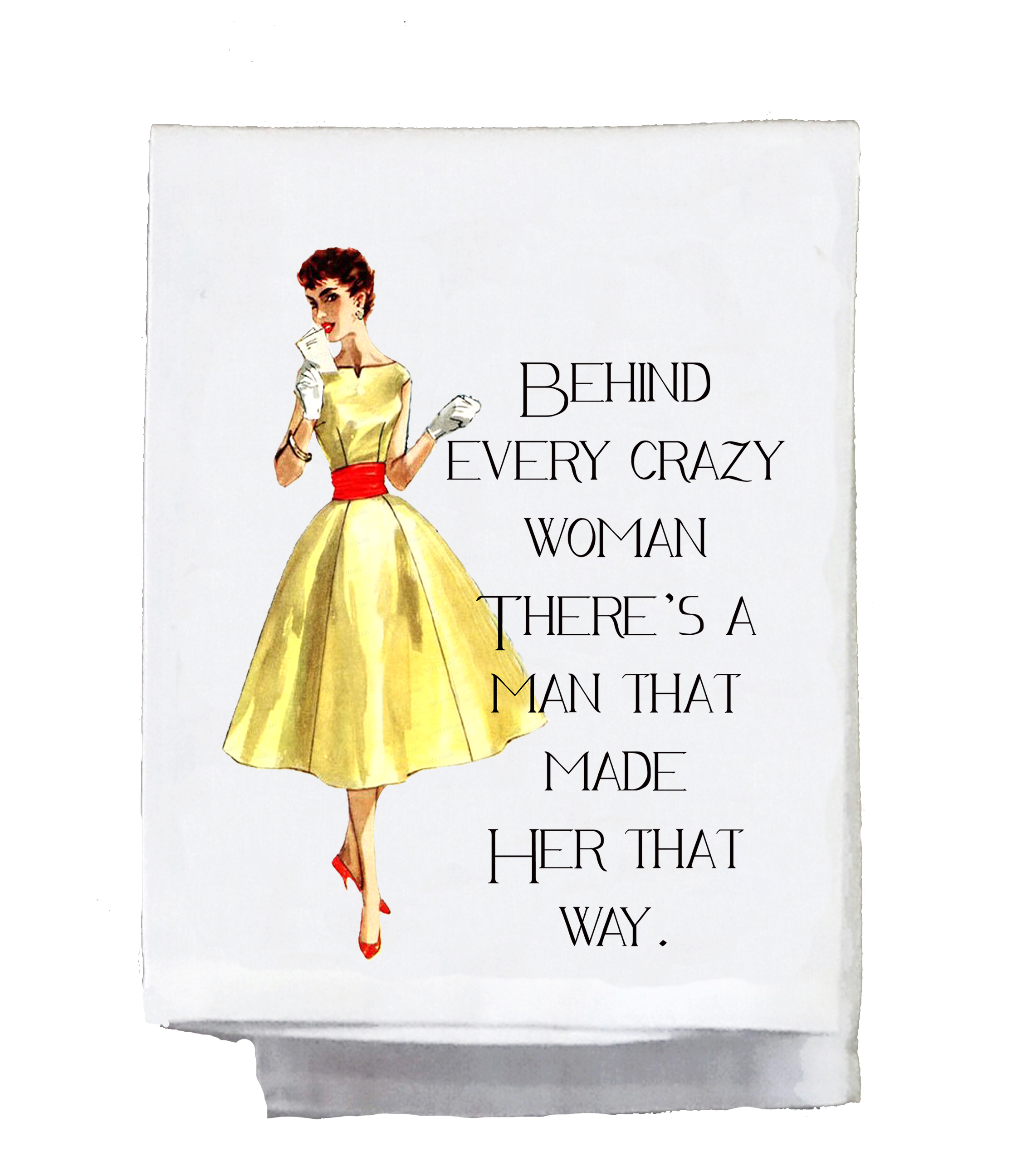 Add a little humor to your kitchen with the Behind Every Crazy Woman Tea Towel. This 20"x20" folded towel is made from 100% polyester and features a decorative design. It's machine washable and dryable for easy cleanup. Designed and pressed in Louisiana, USA. (Just what every crazy woman needs in her kitchen!)