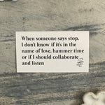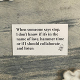 "WHEN SOMEONE SAYS STOP, I DON'T KNOW IF IT'S IN THE NAME OF LOVE, HAMMER TIME OR IF I SHOULD COLLABORATE AND LISTEN."