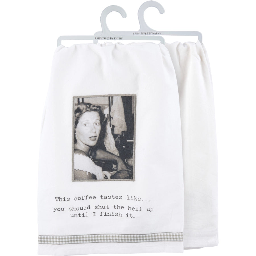 A white cotton kitchen towel from our Trash Talk By Annie Collection displaying a vintage photograph on a stitched art panel with grey gingham ribbon and humorous sentiment that reads "This Coffee Tastes Like... You Should Shut The Hell Up Until I Finish It." Our This Coffee Tastes Like Up kitchen towel is machine-washable for convenient cleaning. Packaged on a clear plastic hanger to easily display on rack. A fun and functional everyday kitchen accent.