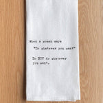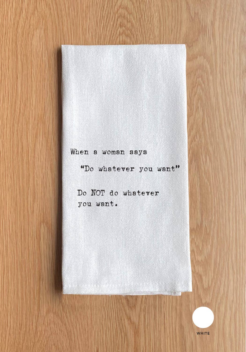 Get creative in the kitchen with our "When A Woman Says" tea towel! Made of 100% cotton, each towel is hand-printed for a unique touch. Absorbent and durable, it's perfect for everyday use and makes a fantastic hostess gift. Keep it soft and vibrant with a cold wash and warm dry. Measures 20"x25".