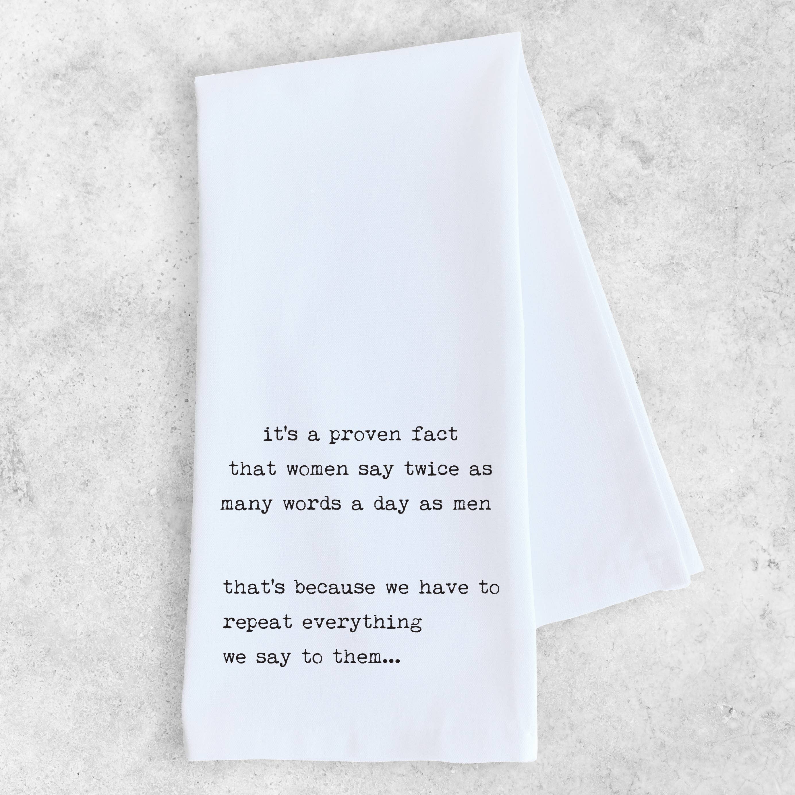 "Spice up your kitchen with the Why Women Talk So Much tea towel! Made with 100% cotton, this quirky towel features a fun fact - women say twice as many words as men! (No wonder we have to repeat ourselves). Upgrade your dish drying game with this playful and humorous addition."