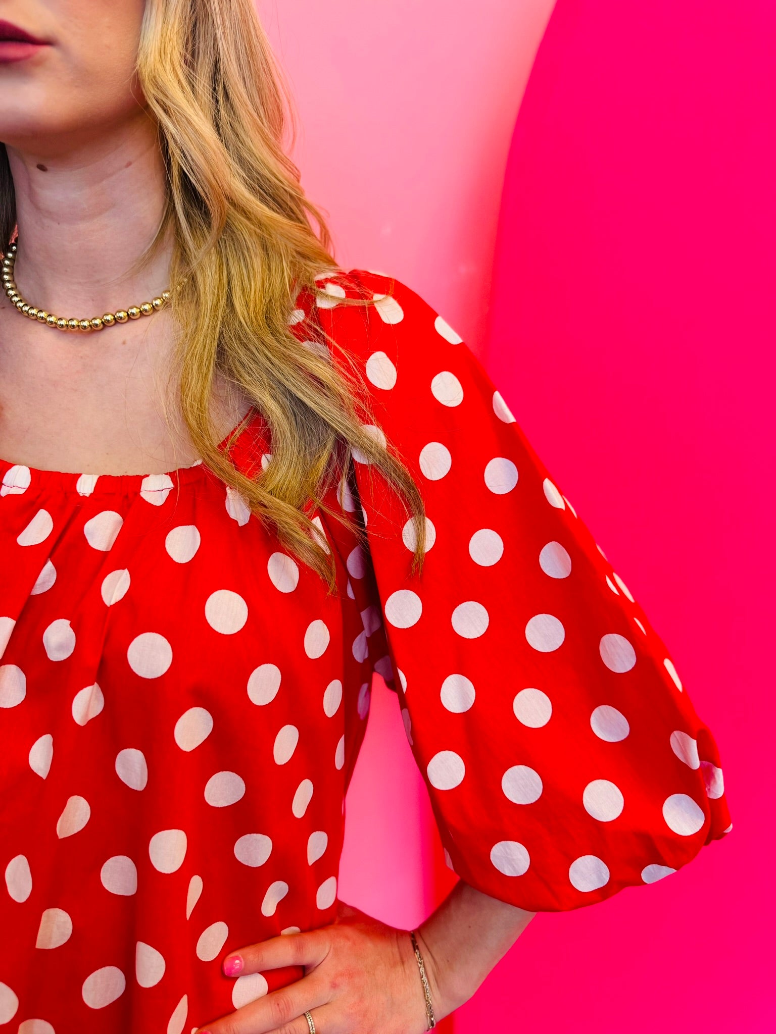 3/4 Balloon Sleeves: Stylish sleeves add volume and shape, balancing the playful polka dot pattern with modern detail.