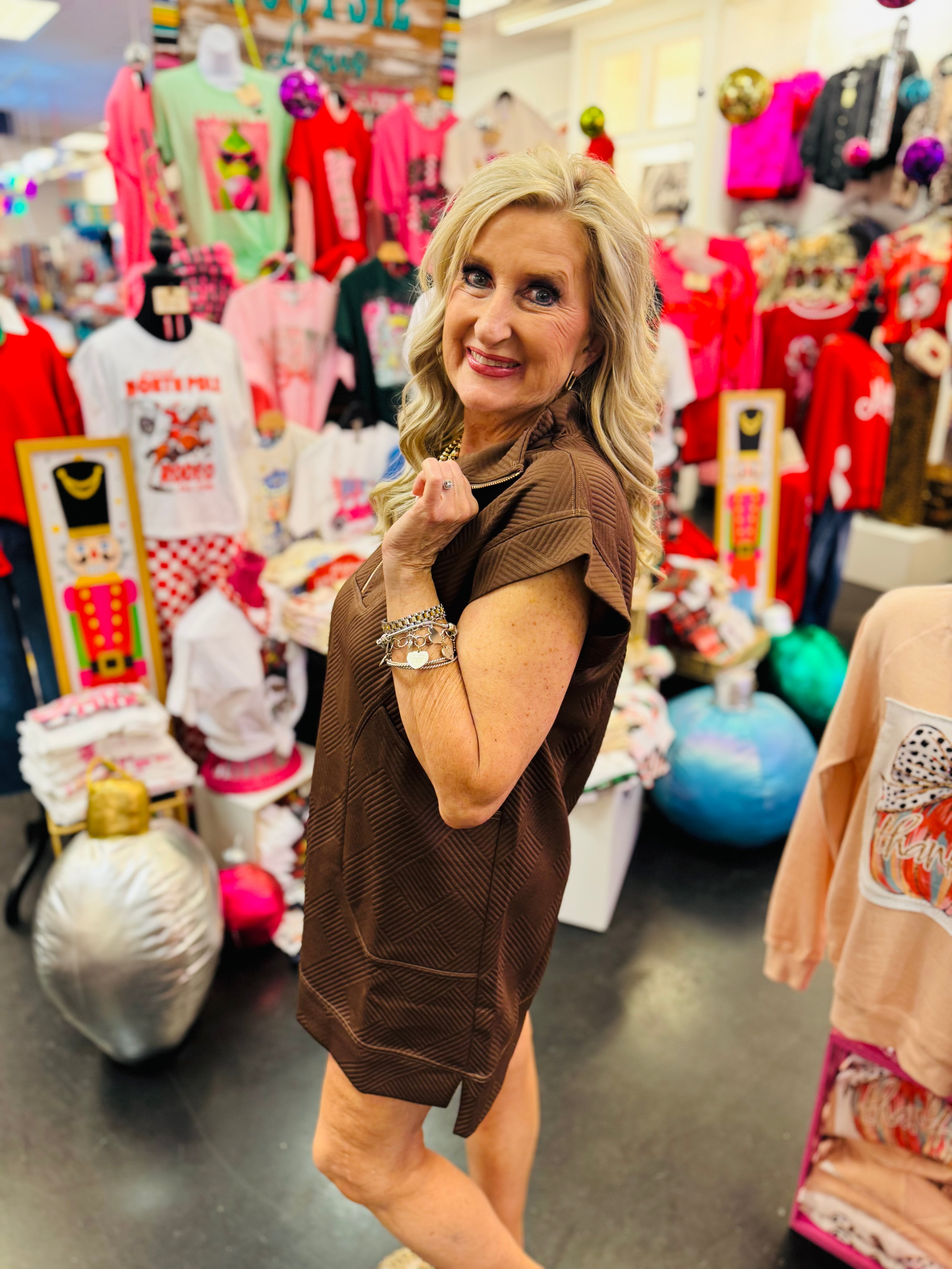 Step out in chic comfort with our Brown Quarter Zipper Mini Dress, a textured knit jacquard piece designed for modern style. This versatile mini dress features a sophisticated quarter-zipper neckline, allowing for adjustable styling. Practical side pockets add a touch of functionality, while the trendy high-low hem and side slits ensure easy movement and a flattering silhouette. With a chest measurement of 44" (approx. from Small), this dress offers a comfortable yet refined fit. It provides both comfort and subtle stretch, perfect for any occasion, transitioning seamlessly from a casual day out to an evening gathering. This stylish and practical dress is a must-have for your contemporary wardrobe.