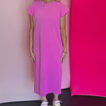 You'll love our soft and stylish Candy Pink Short Sleeve Midi Dress. It's a not-so-basic staple, featuring a flattering round neckline and a comfortable stretch cotton blend. A subtle side slit provides extra movement and style. This is a closet must-have for effortless everyday looks, offering a versatile foundational piece you can wear for any occasion, from casual days to evening outings. Add a trendy scarf necklace to elevate your look!