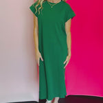 You'll love our soft and stylish Dark Green Short Sleeve Midi Dress. It's a not-so-basic staple, featuring a flattering round neckline and a comfortable stretch cotton blend. A subtle side slit provides extra movement and style. This is a closet must-have for effortless everyday looks, offering a versatile foundational piece you can wear for any occasion, from casual days to evening outings. Add a trendy charm scarf necklace to elevate your style.