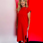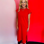 You'll love our soft and stylish Red Short Sleeve Midi Dress. It's a not-so-basic staple, featuring a flattering round neckline and a comfortable stretch cotton blend. A subtle side slit provides extra movement and style. This is a closet must-have for effortless everyday looks, offering a versatile foundational piece you can wear for any occasion, from casual days to evening outings. Add a trendy charm scarf necklace for an elevated look!