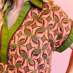 Step into retro vibes with modern charm in our Terra Cotta Abstract Ruffle Mini Dress. This captivating mini dress features a bold terra cotta and green geometric pattern set against a vibrant pink backdrop, creating a striking and unique aesthetic. The contrasting green spread collar and sleeve trim add a refined touch, perfectly complementing the energetic print. Designed with practical side pockets and a relaxed fit that flows into a flared flounce ruffle hemline, this dress offers both comfort and undeniable style. Fully lined, woven, and non-sheer, this lightweight dress ensures breathable wear.