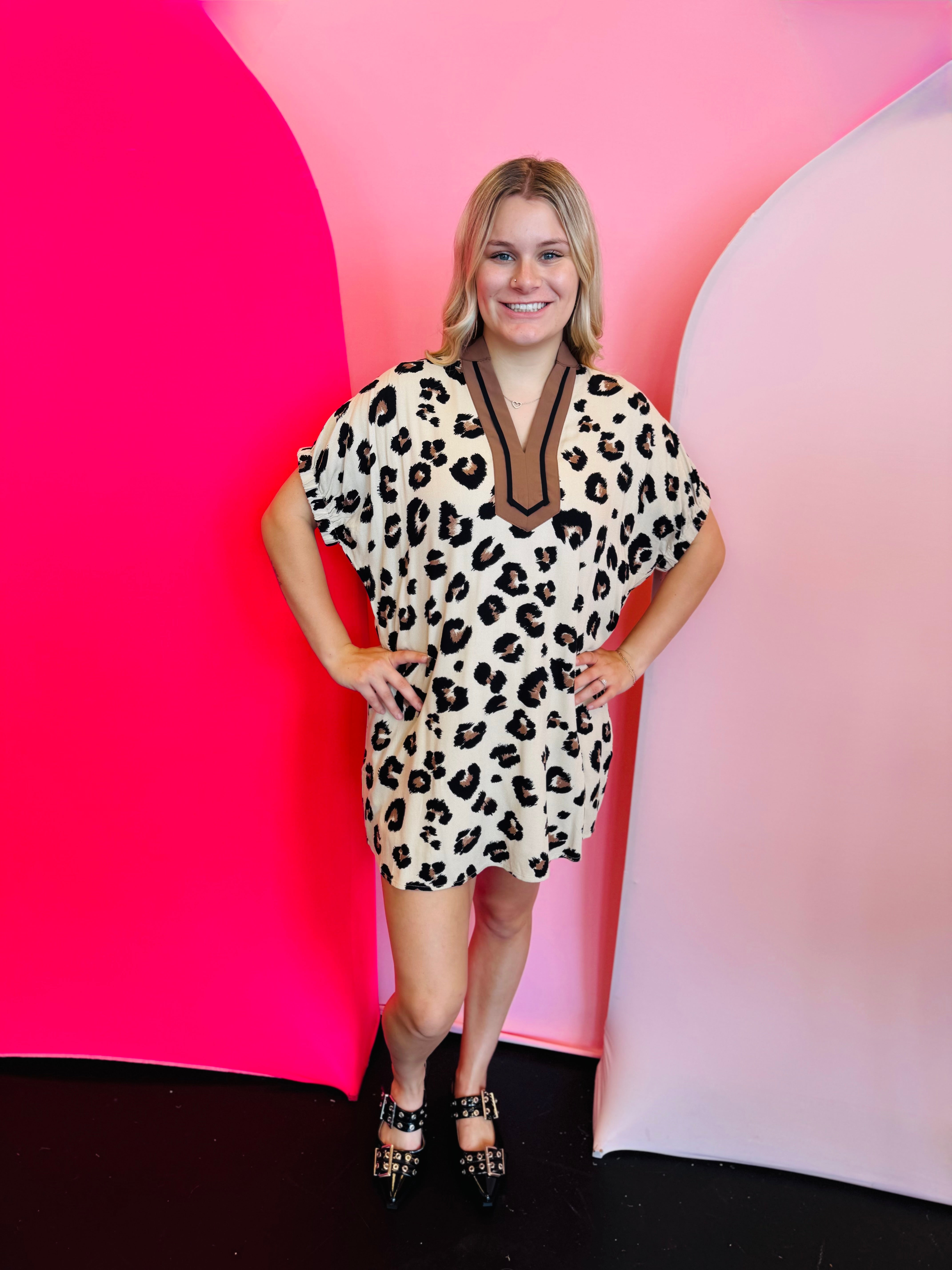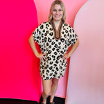 Unleash your wild side with our Leopard Print Dolman Dress, a perfect blend of comfort and chic. This oversized mini dress features a classic, all-over leopard print, designed with elasticated dolman sleeves for a relaxed, flowy silhouette. A solid black binding at the neckband and collar provides a clean, contrasting finish. Crafted from a lightweight, non-sheer woven fabric, it is fully lined for complete coverage and even includes convenient side pockets! It’s an effortlessly stylish piece for any occasion.