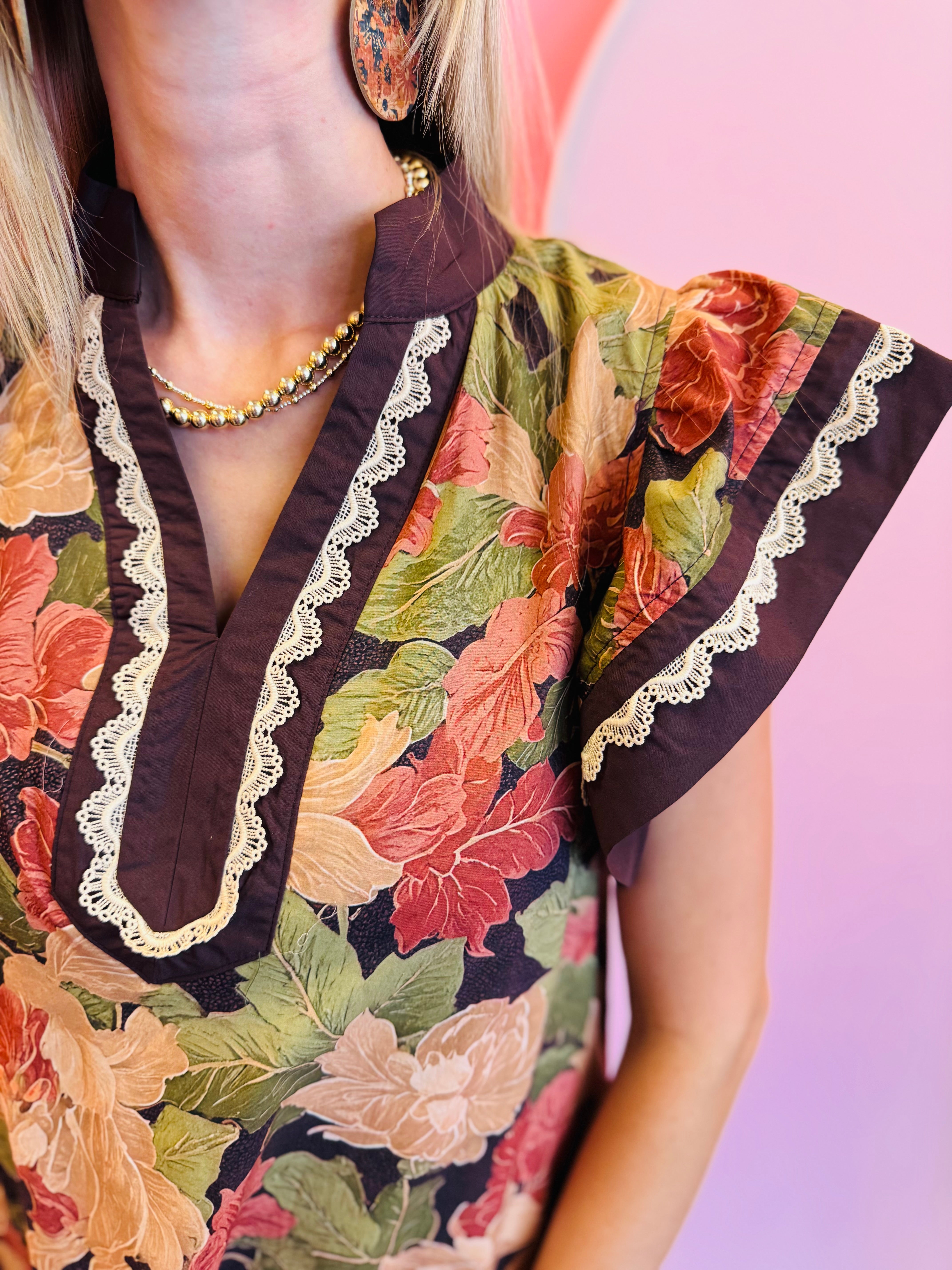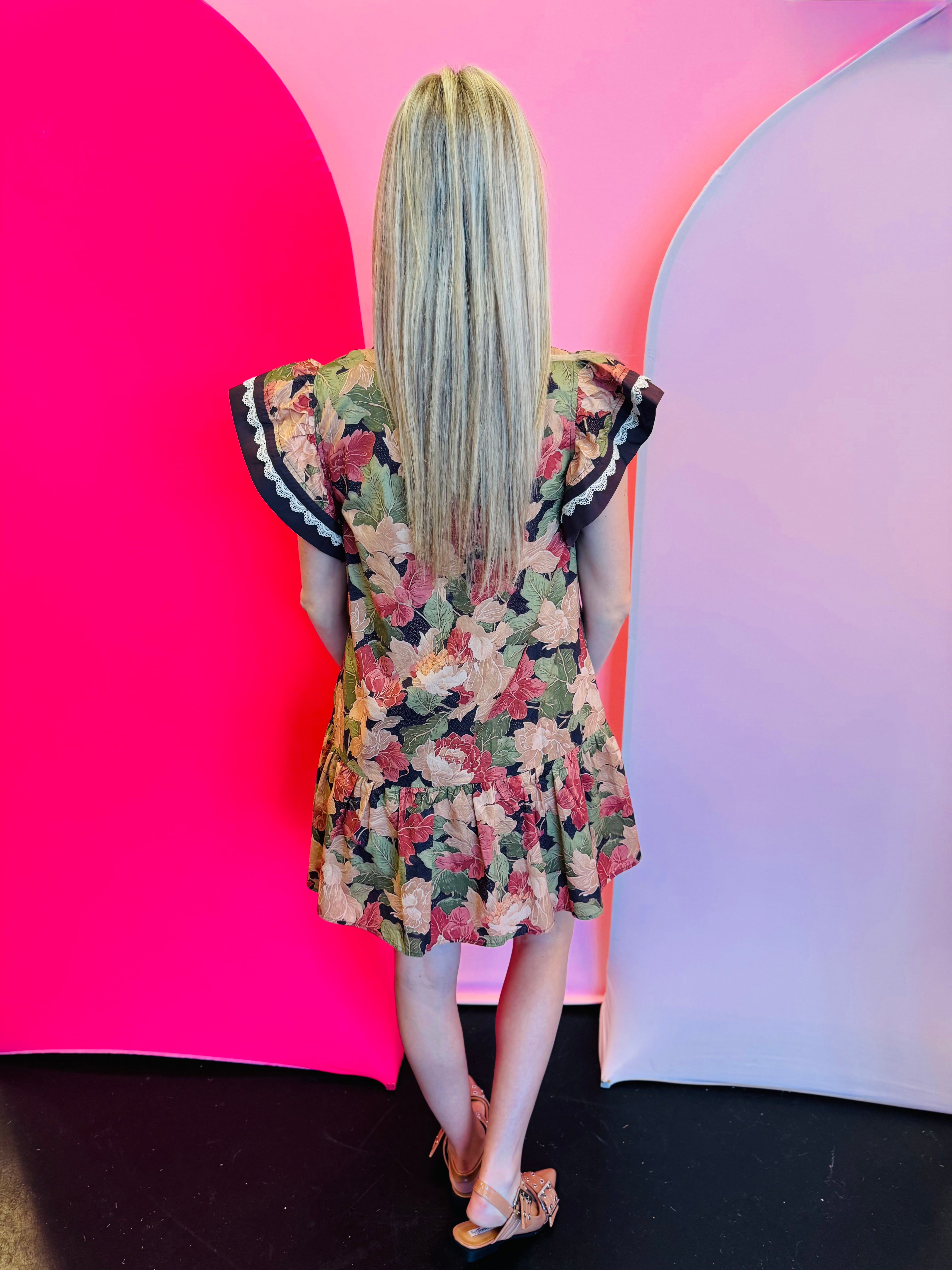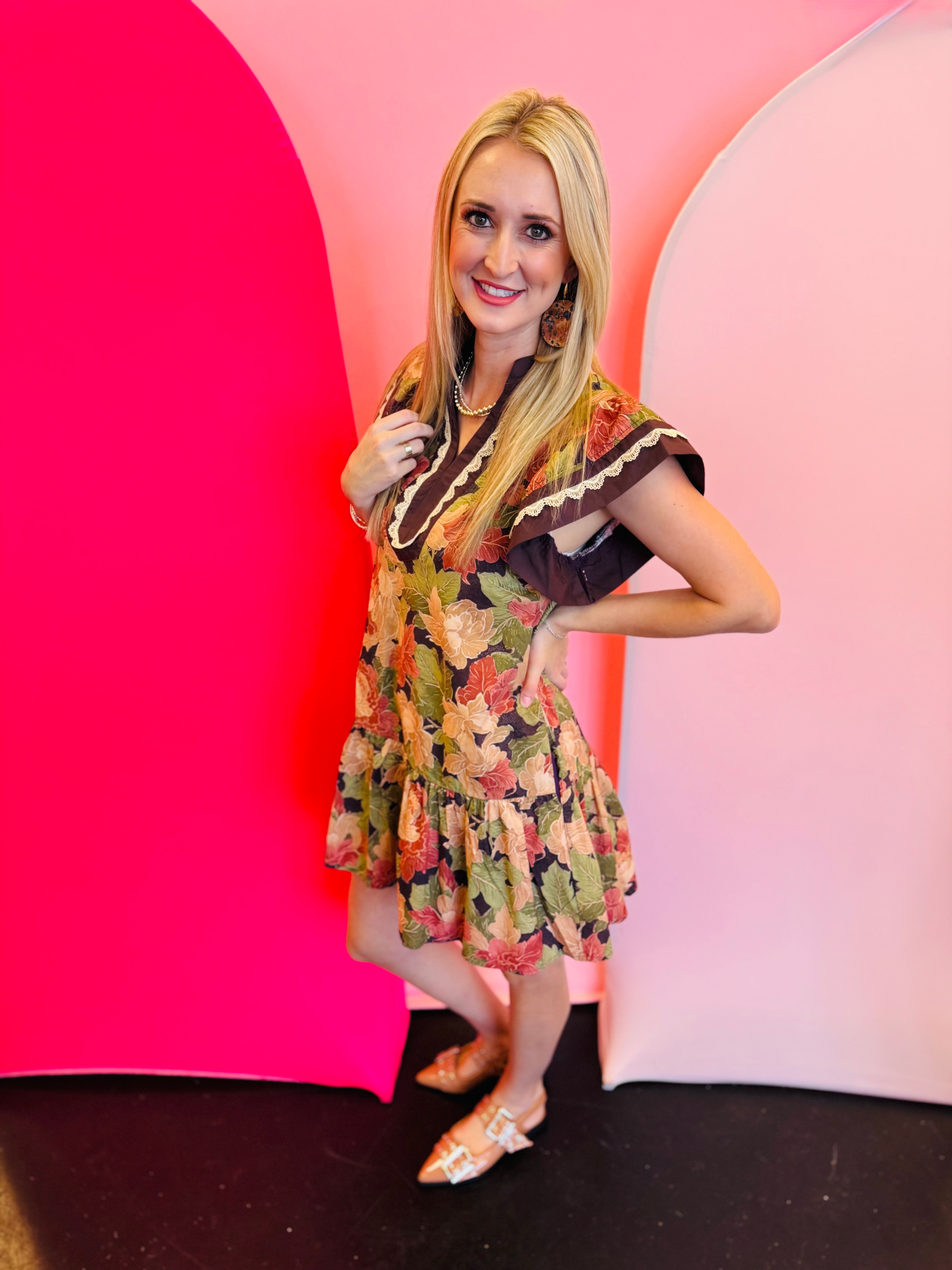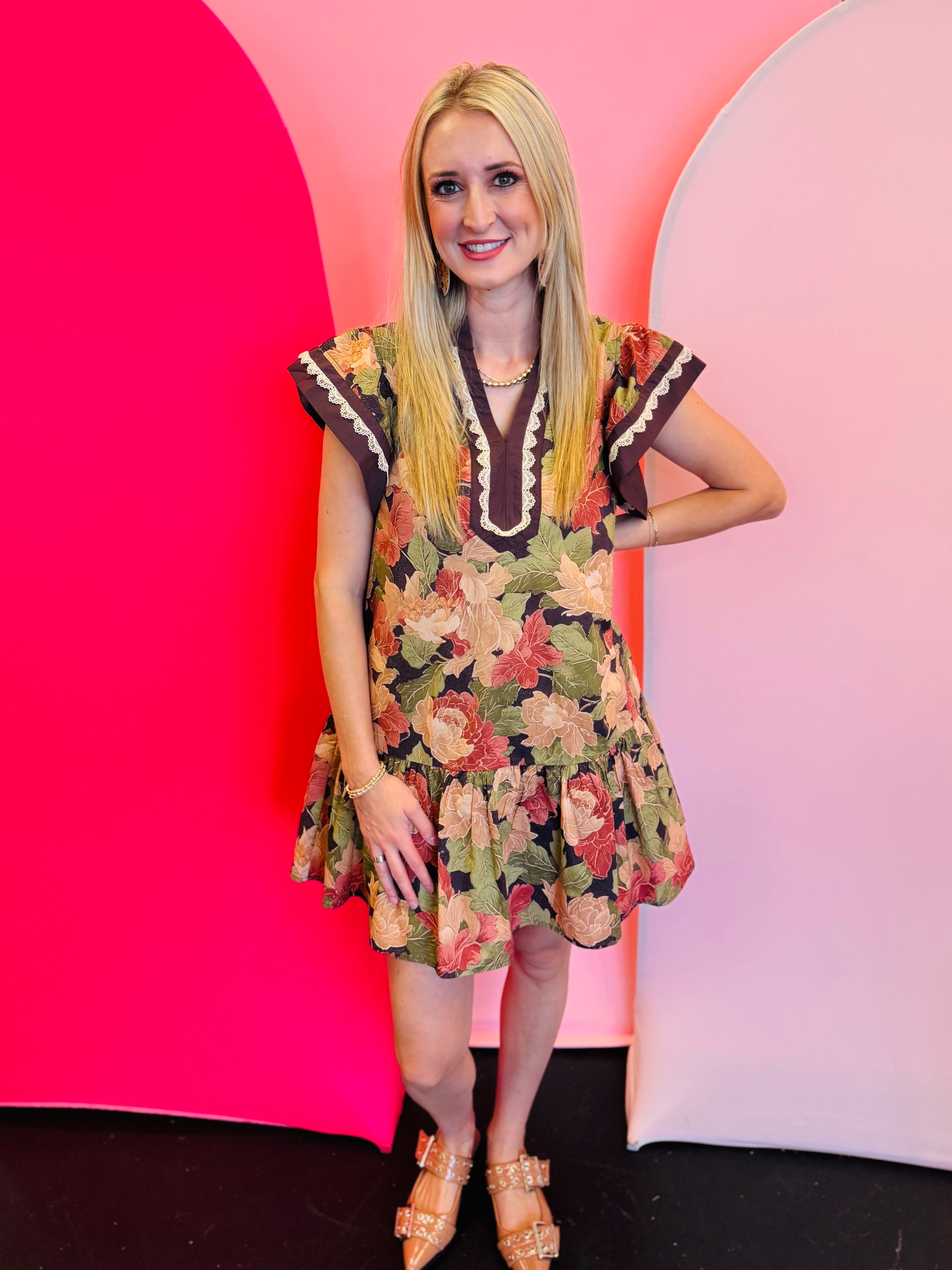 Embrace autumnal elegance with our Brown Floral Flutter Sleeve Mini Dress, a stunning piece that captures the essence of the season. This mini dress showcases a rich, earthy-toned floral print, evoking a warm and inviting aesthetic. The delicate flutter sleeves add a touch of feminine grace, while the scallop inset contrast accent V-neck band enhances its sophisticated charm. Designed with practical side pockets and a tiered hemline, this dress seamlessly blends style with convenience. Fully lined, woven, and non-sheer, this lightweight dress ensures breathable comfort and a beautiful drape for any occasion, from casual outings to more refined gatherings.
