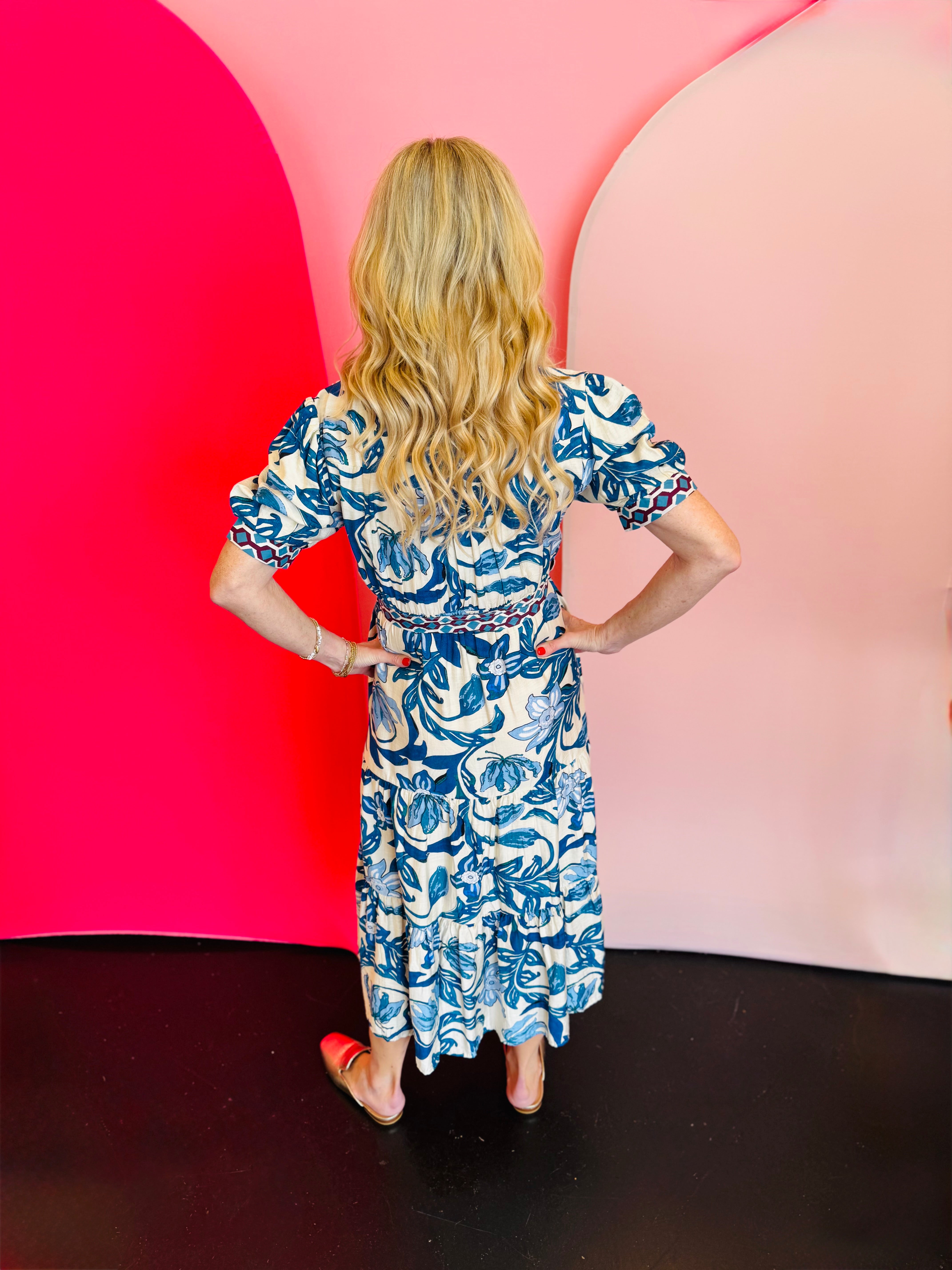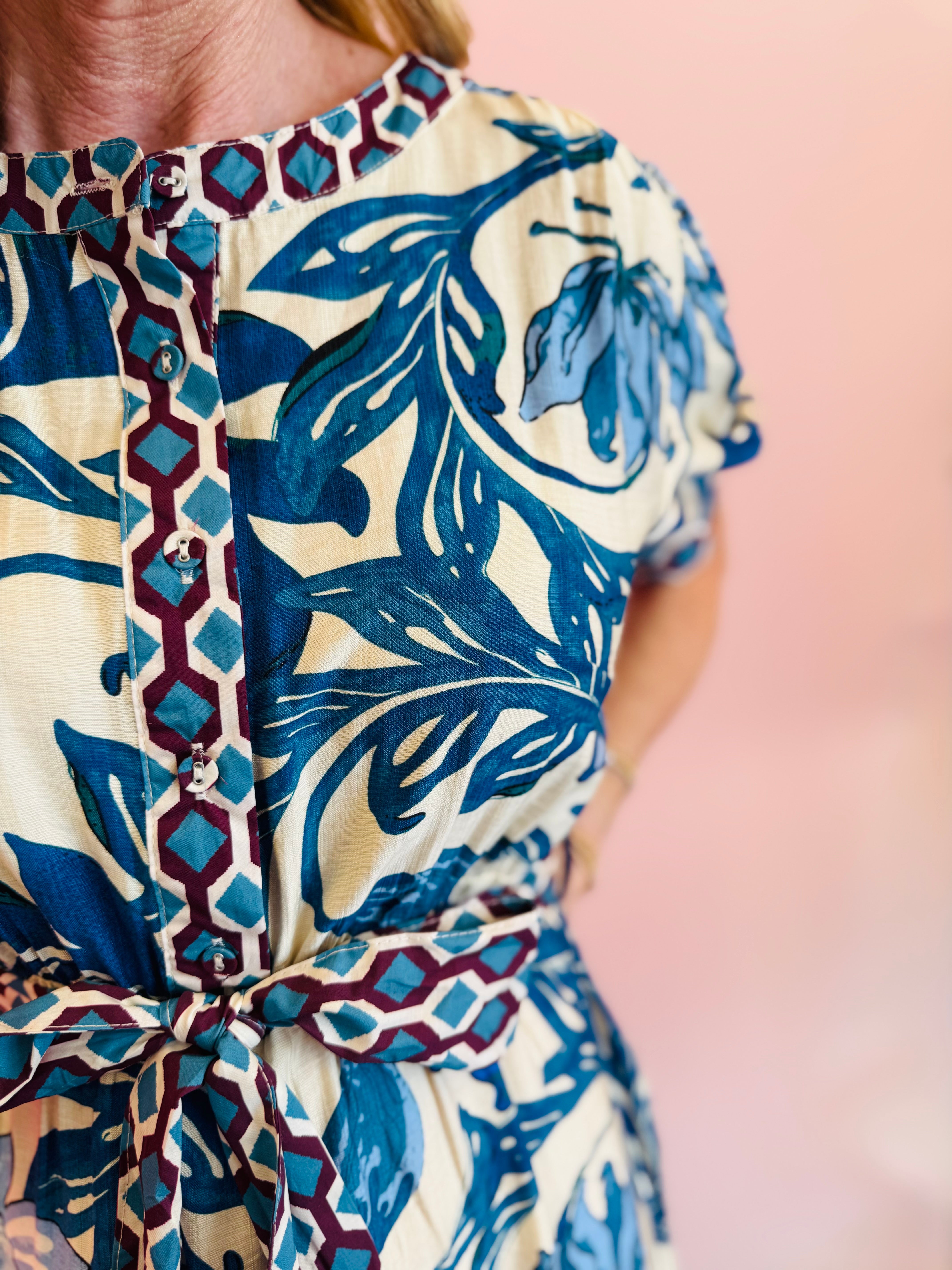 Step into effortless elegance with this Blue Floral Print Tiered Dress, a stunning maxi dress perfect for any occasion. Featuring a bold blue and white tile-inspired print, it exudes a fresh, captivating aesthetic. The dress is designed with a graceful half-button placket and contrasting print accents, adding intricate detail. Short sleeves offer comfort, while the belted waist cinches beautifully to create a flattering silhouette. A flowing tiered skirt cascades elegantly, providing graceful movement and a sophisticated finish. This dress seamlessly blends vibrant patterns with a relaxed, yet refined, form for a truly standout look.