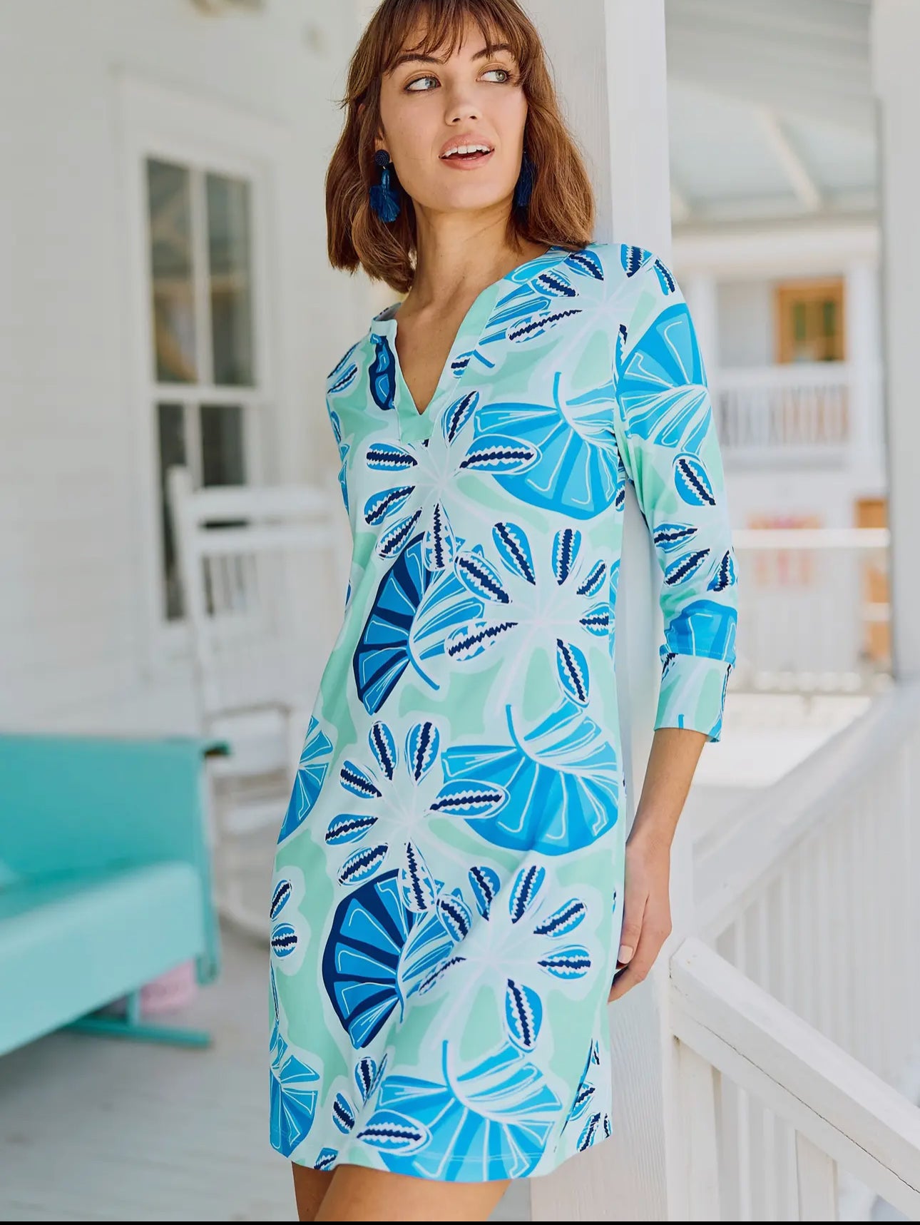 Feel the summertime vibes with our Nantucket Blooms Dress! This dress features all the shades of blue, perfect for any summer occasion. Our UPF 50 fabric protects you from the sun while keeping you cool and comfy with its stretchy material. Stay stylish and protected with our Nantucket Blooms Dress!