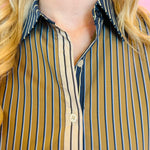 Brighten your wardrobe with the Olive & Navy Stripe Dress, a colorful statement piece that’s both chic and easy to wear. Designed with long sleeves and a button-down front, this dress offers a classic silhouette with a modern twist. The multi-color stripe fabric features bold olive and navy tones arranged in a striking color-block stripe pattern, making it perfect for everything from brunch to the office. Thoughtful details like side pockets add everyday convenience, while the relaxed fit ensures all-day comfort. Pair it with sneakers for a casual outing or dress it up with boots and a belt for a more polished look. Versatile and eye-catching, the Olive & Navy Stripe Dress is a must-have for effortless, colorful style.