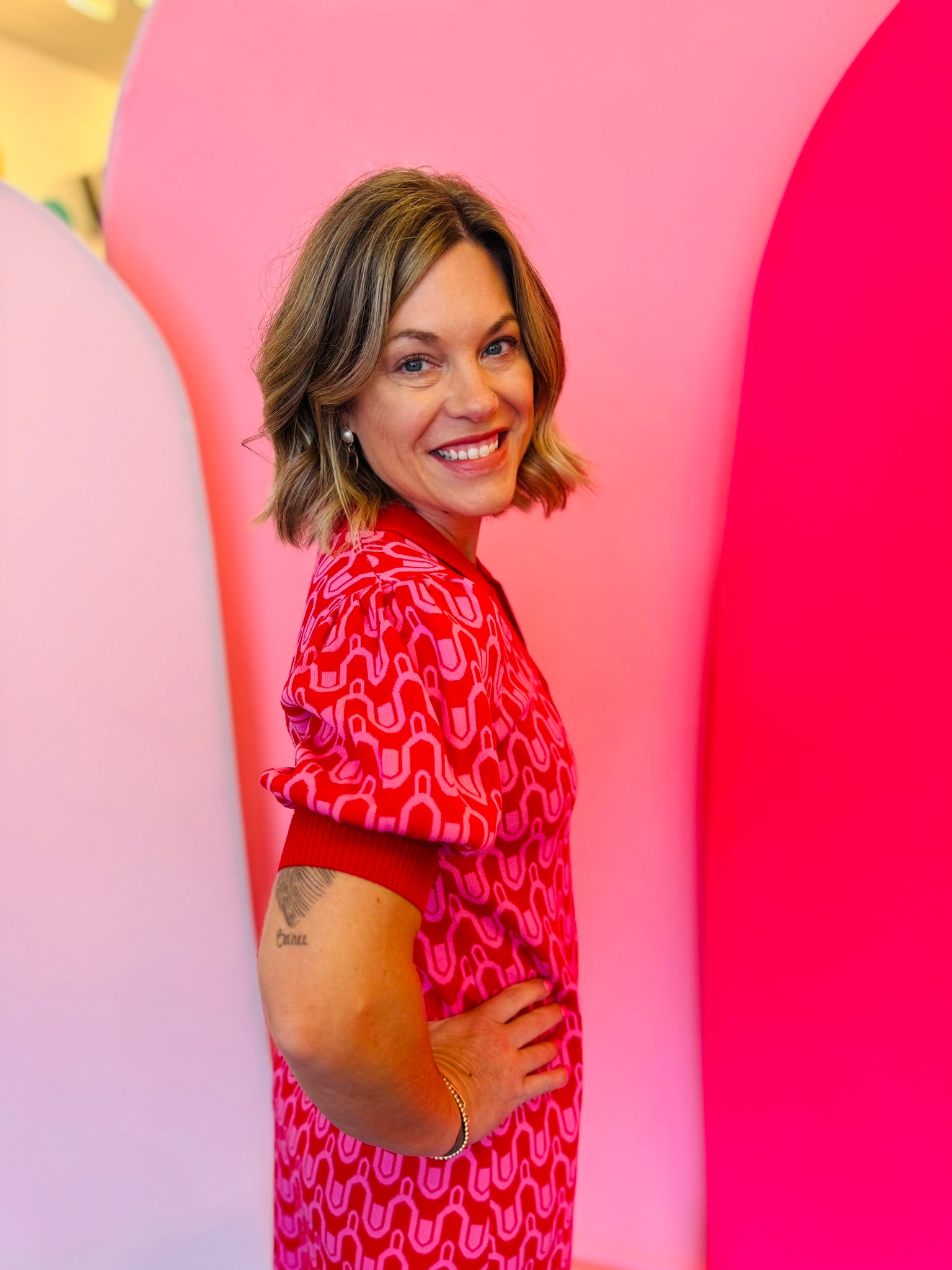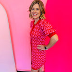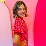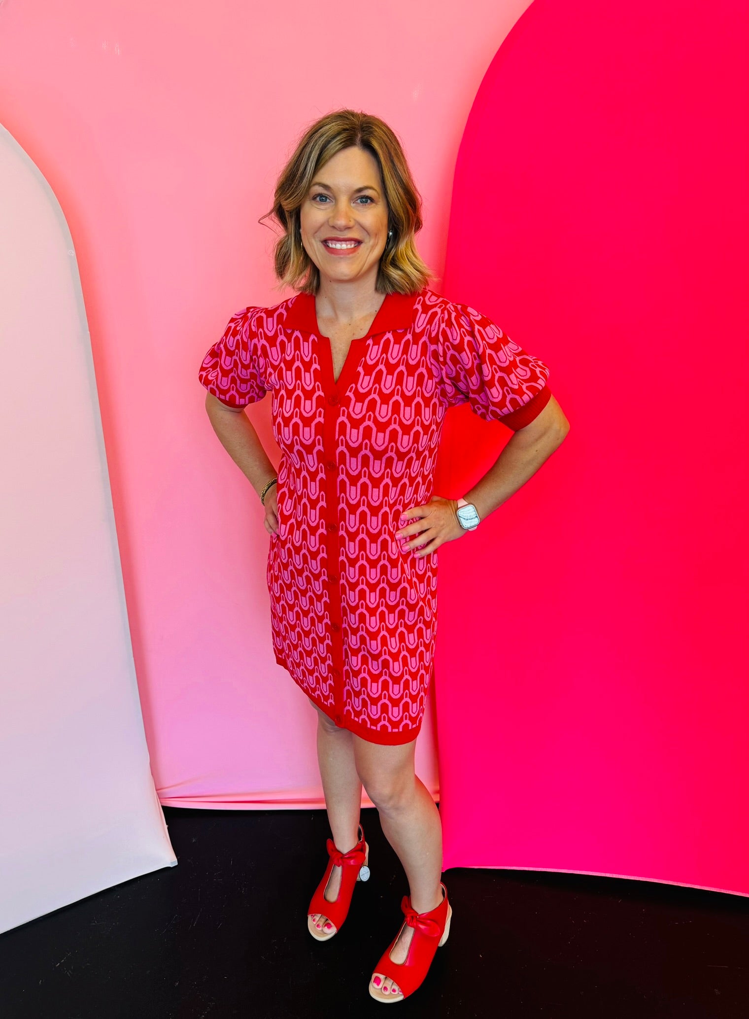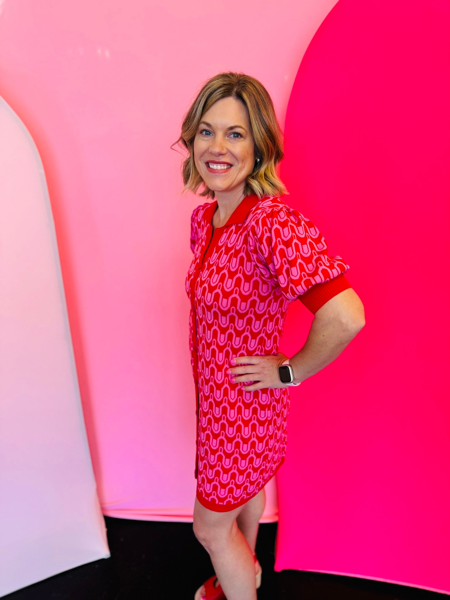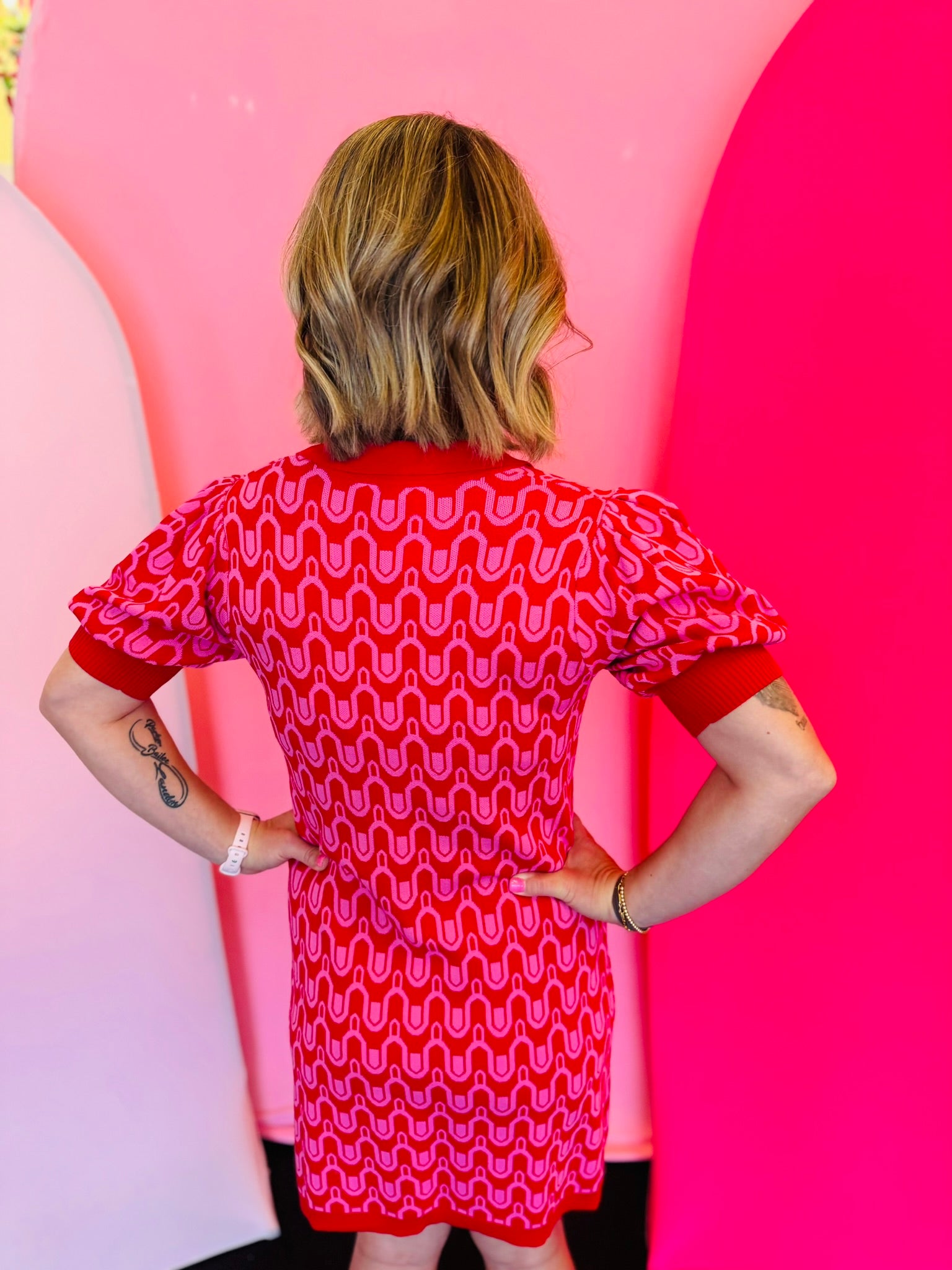 Indulge in sophistication with our exclusive red dress featuring pink abstract designs. The puff short sleeves add a touch of elegance while the collared v-neck enhances your silhouette. Elevate your style and stand out in this luxurious piece.