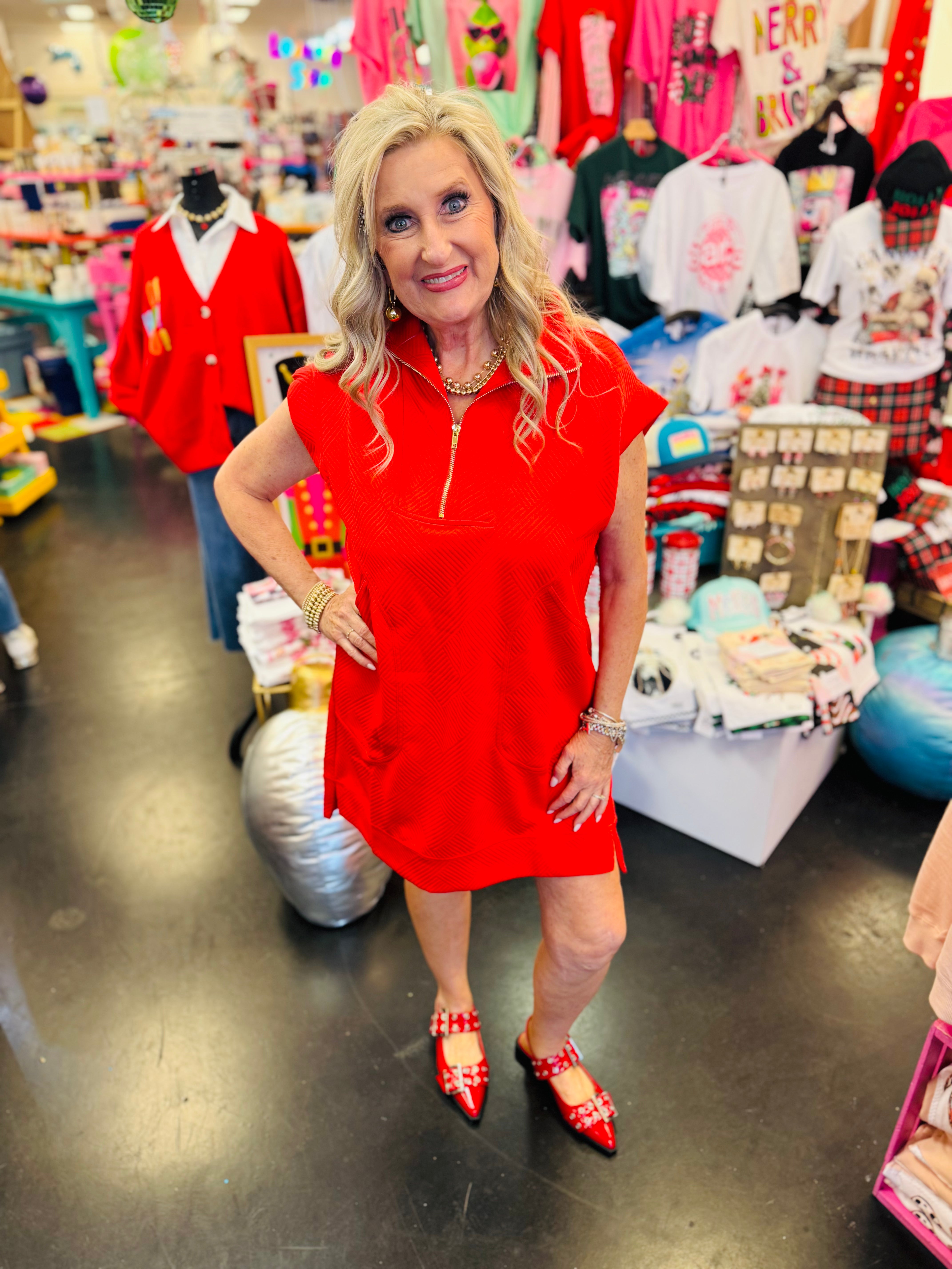 Step out in chic comfort with our Ruby Red Quarter Zipper Mini Dress, a textured knit jacquard piece designed for modern style. This versatile mini dress features a sophisticated quarter-zipper neckline, allowing for adjustable styling. Practical side pockets add a touch of functionality, while the trendy high-low hem and side slits ensure easy movement and a flattering silhouette. With a chest measurement of 44" (approx. from Small), this dress offers a comfortable yet refined fit. It provides both comfort and subtle stretch, perfect for any occasion, transitioning seamlessly from a casual day out to an evening gathering. This stylish and practical dress is a must-have for your contemporary wardrobe.