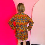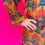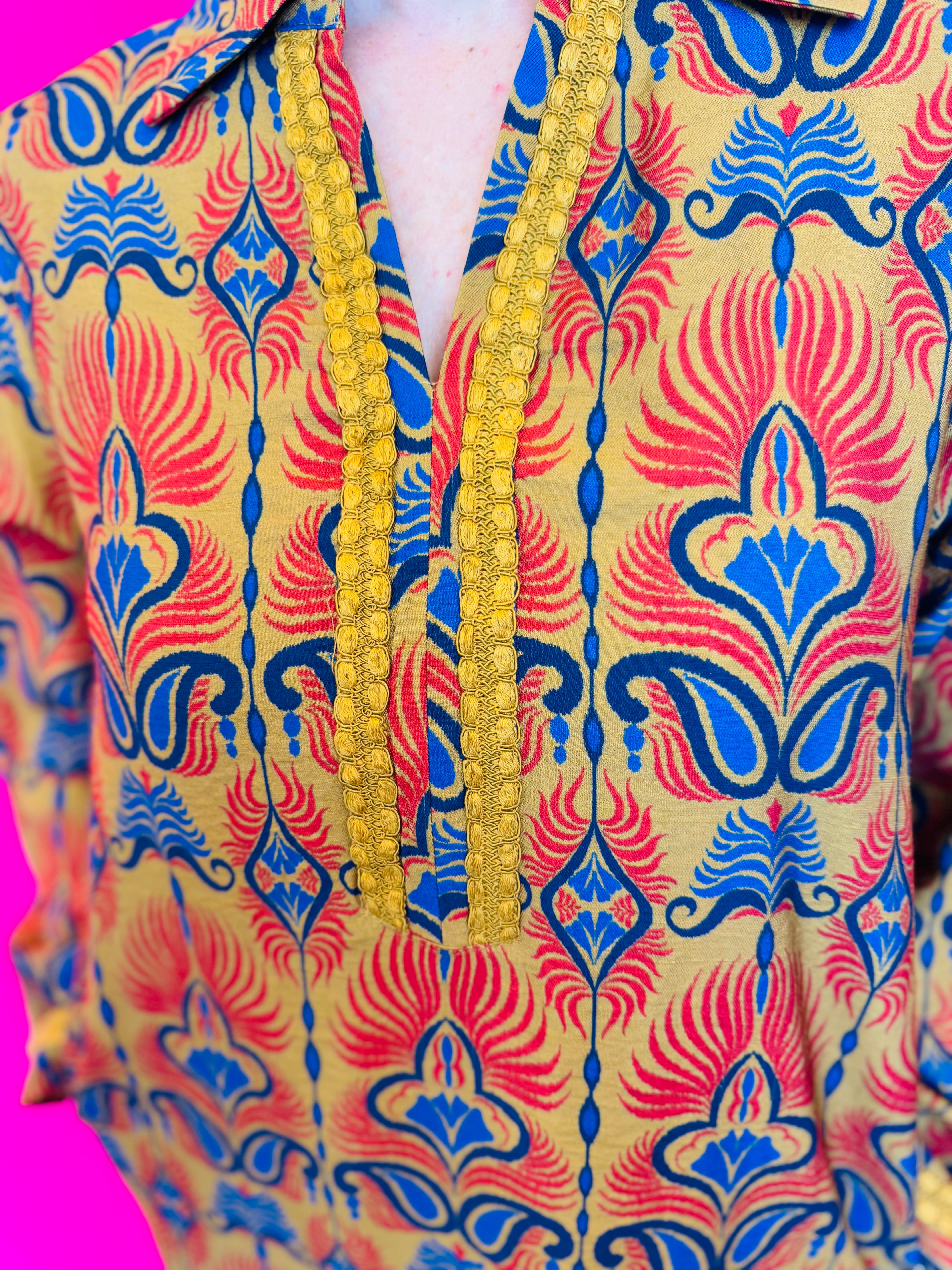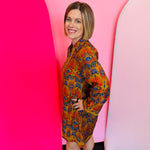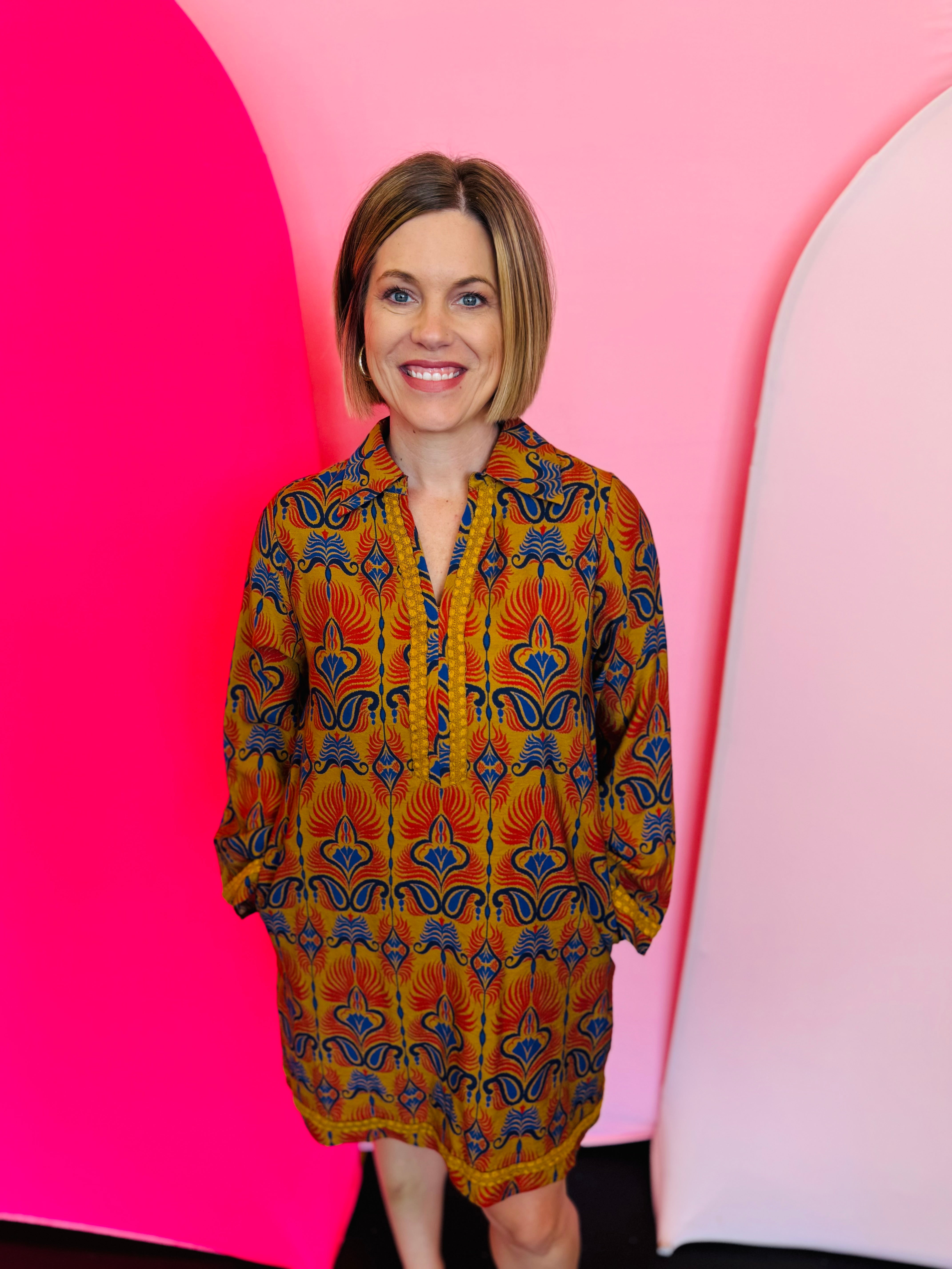 Step into effortless style with the Toffee Boho Print Dress, a relaxed yet elevated piece that brings bohemian charm to your wardrobe. This long-sleeve shift dress features a striking orange, gold, and navy print that catches the eye while remaining versatile for both casual and dressed-up occasions. The collared neckline adds structure, while side pockets provide functionality without compromising style. Intricate cotton braided trim detail enhances the neckline, cuffs, and hem, offering a subtle touch of texture and artisanal flair. Crafted from a lightweight blend of 77% rayon and 23% polyester, this dress drapes beautifully with a comfortable, relaxed fit that makes it perfect for all-day wear. Whether styled with boots for fall festivals or heels for a polished dinner look, this boho-inspired dress is a standout piece for every season.