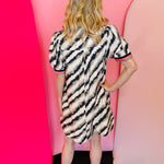 Designed in a versatile black, white, and grey stripe pattern, this dress pairs easily with sneakers, sandals, or boots, making it a go-to piece for multiple seasons. The collared neckline and full button-front design give it a structured, tailored feel, while the puff sleeves add a touch of volume and style. Contrast stripe trim at the sleeve openings adds subtle visual interest and a boutique-style finish.